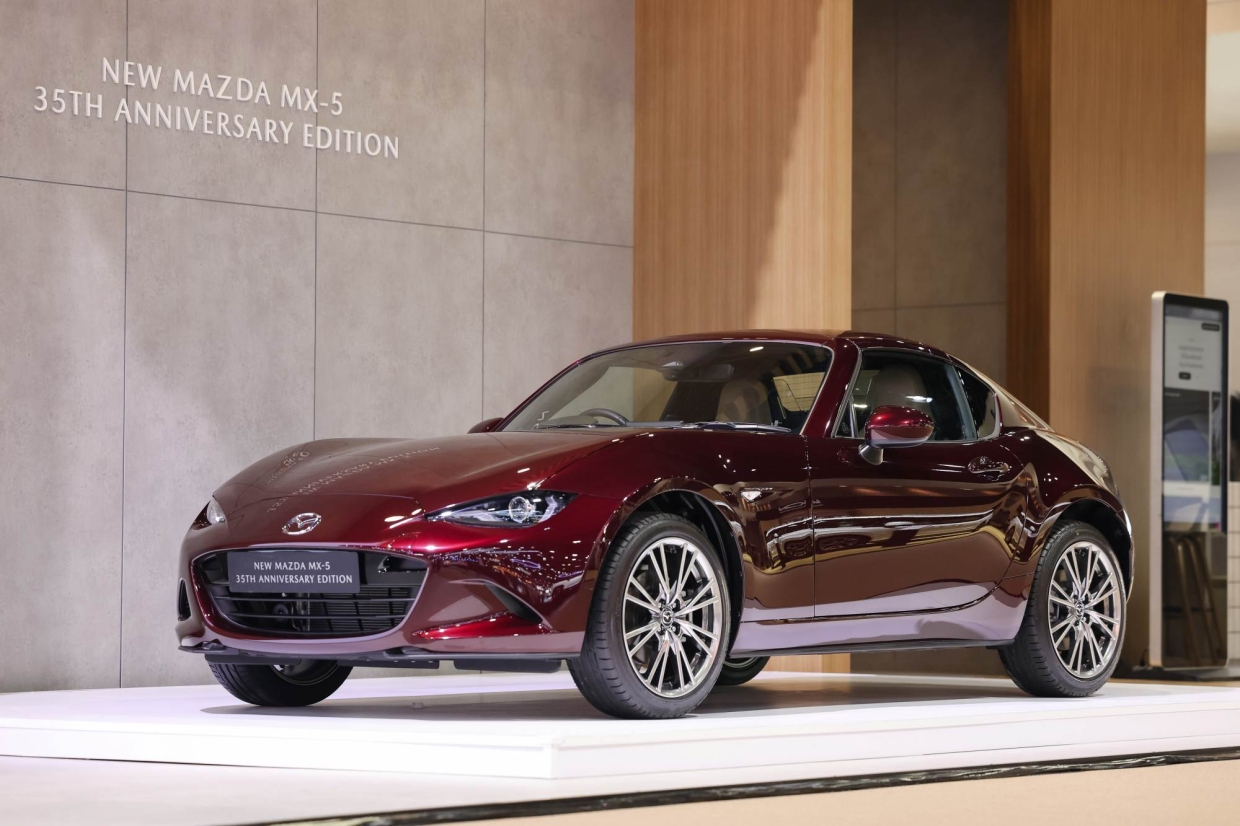 ไม่เพียงเท่านี้ Mazda ยังได้นำยนตรกรรมรุ่นใหม่ล่าสุด แบรนด์ไอคอนยอดนิยม New Mazda MX-5 35th Anniversary Edition หรือรุ่นพิเศษครบรอบ 35 ปี เปิดตัวเพื่อเป็นการร่วมเฉลิมฉลองการครบรอบ 35 ปี นับตั้งแต่ MX-5 ได้เปิดตัวเป็นครั้งแรก มาจัดแสดงให้แฟนๆ ในประเทศไทยได้ชม และครอบครองเป็นเจ้าของ โดยมาพร้อมการตกแต่งพิเศษที่แตกต่างจากรุ่นทั่วๆ ไป เพื่อถ่ายทอดความพิเศษในทุกองค์ประกอบ ไม่ว่าจะเป็นสีภายนอกพิเศษ Artisan Red Premium สัญลักษณ์รุ่นพิเศษ 35th Anniversary Edition พนักพิงศีรษะ และพรม พร้อม Serial Number ที่บริเวณด้านข้างตัวถัง เพื่อบ่งบอกถึงบอกถึงความพิเศษในฐานะรุ่นลิมิเทด รวมถึงเบาะหนังสีพิเศษ Sports Tan หลังคาแข็งเปิด-ปิดด้วยระบบไฟฟ้า กระจกมองข้างสีเดียวกับตัวรถ พร้อมล้ออัลลอยขนาด 17 นิ้ว สี Bright ถ่ายทอดภาพลักษณ์สปอร์ทพรีเมียม และความพิเศษได้อย่างมีเอกลักษณ์ วางจำหน่ายในจำนวนจำกัด ในราคา 3,069,000 บาท