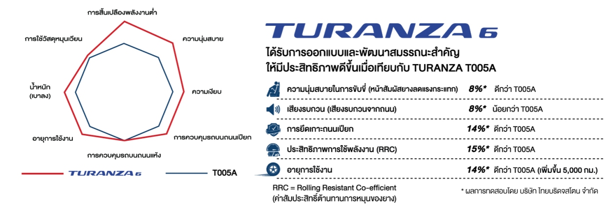 **ผลทดสอบโดย บริษัท ไทยบริดจสโตน จำกัด อิงตามเกณฑ์การทดสอบมาตรฐานภายใน Bridgestone Turanza 6 เทียบกับ Bridgestone Turanza T005A (ขนาดอ้างอิง 215/55R17)**