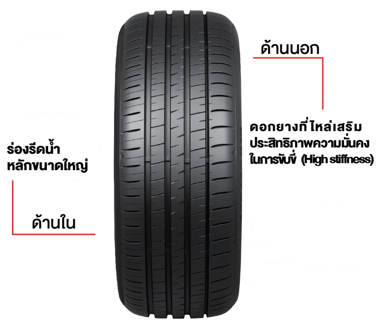 ด้านใน ร่องรีดน้ำหลักขนาดใหญ่ ช่วยลดอาการเหินน้ำ เพิ่มสมรรถนะการทรงตัว และการควบคุมขณะขับขี่บนถนนเปียก