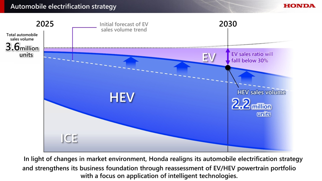 โดย Honda จะปรับกลยุทธ์ธุรกิจยานยนต์ไฟฟ้า ภายใต้ 2 ทิศทาง คือ เพิ่มขีดความสามารถในการแข่งขันของรถยนต์ไฟฟ้า (EV) และรถยนต์ไฮบริด (HEV) ผ่านการประยุกต์ใช้เทคโนโลยีอัจฉริยะ และเสริมรากฐานธุรกิจให้แข็งแกร่ง ผ่านการปรับพอร์ทโฟลิโอด้านระบบขับเคลื่อนใหม่ อีกทั้งเตรียมพัฒนาระบบช่วยเหลือผู้ขับขี่ (ADAS) เจเนอเรชันใหม่ พร้อมผนวกความร่วมมือกับพาร์ทเนอร์ทางธุรกิจรวมถึงปรับแผนเปิดตัวรถใหม่ เนื่องด้วยการชะลอตัวของตลาด EV ทั่วโลกที่ส่งผลให้เป้าหมายสัดส่วนยอดขาย EV ทั่วโลกของ Honda ในปี 2030 อาจต่ำกว่าเป้าหมาย 30 % จากที่เคยคาดการณ์ไว้ก่อนหน้า โดยนับจากนี้จะเน้นขุมพลังไฮบริด เป็นหลักในการเปลี่ยนผ่านเข้าสู่ยุคยานยนต์ไฟฟ้าอย่างเต็มรูปแบบ โดยเฉพาะรถยนต์ไฮบริด (HEV) เจเนอเรชันใหม่ที่จะเปิดตัวตั้งแต่ปี 2027 เป็นต้นไป พร้อมเร่งขยายไลน์อัพไฮบริดอย่างต่อเนื่อง ซึ่งจากการปรับแนวทางนี้ Honda ตั้งเป้าที่จะเพิ่มยอดขายในปี 2030 ให้มากกว่าระดับปัจจุบันที่ 3.6 ล้านคัน โดยมีเป้าหลักอยู่ที่ยอดขายรถยนต์ไฮบริด (HEV) ที่ 2.2 ล้านคัน