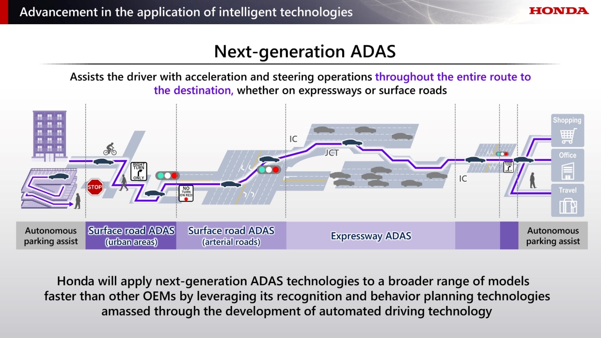 Honda อยู่ระหว่างการพัฒนาระบบช่วยเหลือผู้ขับขี่ขั้นสูง (ADAS) เจเนอเรชันใหม่ ที่สามารถช่วยในการขับขี่ได้ เช่น การเร่ง และการบังคับเลี้ยวตลอดเส้นทาง ตามจุดหมายที่ผู้ขับขี่ป้อนลงในระบบนำทางไม่ว่าจะขับบนทางด่วน หรือถนนในเมือง ผ่านการต่อยอดองค์ความรู้ที่สั่งสมจากการพัฒนาเทคโนโลยี การขับขี่อัตโนมัติ