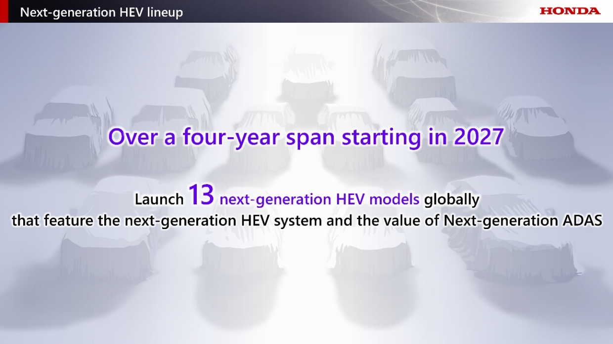 มีแผนเปิดตัวรถไฮบริด (HEV) เจเนอเรชันใหม่ของ Honda รวมทั้งหมด 13 รุ่นทั่วโลก ภายในระยะเวลา 4 ปี นับตั้งแต่ปี 2027 เพื่อขยายไลน์อัพไฮบริด (HEV) ให้ครอบคลุม และตอบรับกับความต้องการของตลาดที่เพิ่มขึ้นอย่างต่อเนื่อง