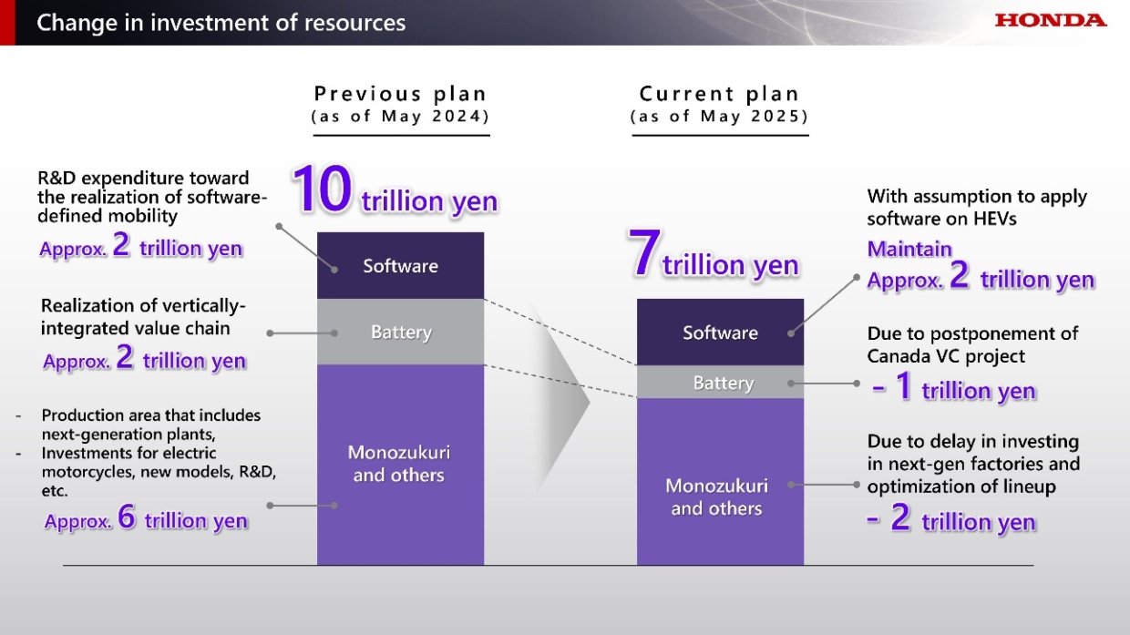 สำหรับแผนการลงทุนในกลยุทธ์ด้าน EV ที่ประกาศไว้เมื่อปีที่ผ่านมา ซึ่งมีมูลค่า 10 ล้านล้านเยน Honda ได้ปรับลดวงเงินลงทุนลง 3 ล้านล้านเยน เหลือ 7 ล้านล้านเยน ภายในปีงบประมาณ 2031 (ปีงบประมาณที่สิ้นสุดวันที่ 31 มีค. 2031) โดยเป็นผลจากการตัดสินใจเลื่อนโครงการสร้าง Value Chain สำหรับ EV แบบครบวงจรในประเทศแคนาดา รวมถึงการยืดเวลาในการสร้างโรงงานที่จะผลิต EV เฉพาะออกไปก่อน