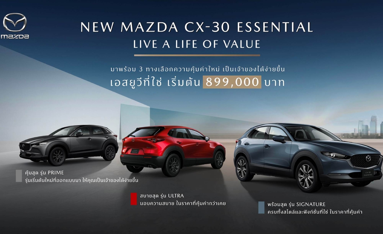 New Mazda CX-30 Essential จะเป็นหนึ่งในทางเลือกที่ดีที่สุดสำหรับลูกค้าที่กำลังมองหารถอเนกประสงค์ที่ตอบโจทย์ทุกความต้องการด้วยไลฟ์สไตล์ที่หลากหลาย ด้วยองค์ประกอบที่ใส่มาครบครัน พร้อมส่งมอบความสนุกสนานในการขับขี่ และดีไซจ์นที่สง่างาม ที่สำคัญมีการปรับราคาใหม่ให้เข้าถึงได้ง่ายขึ้น ลูกค้าที่สนใจสามารถแวะชม และสัมผัสคันจริงได้ที่โชว์รูม Mazda ทั่วประเทศ พร้อมรับข้อเสนอ ดอกเบี้ย 2.49 % (1) ฟรีประกันภัยชั้นหนึ่ง Mazda Premium Insurance 1 ปี (2) พิเศษสุดสำหรับลูกค้า Mazda Family รับฟรีบัตรน้ำมัน มูลค่า 20,000 บาท