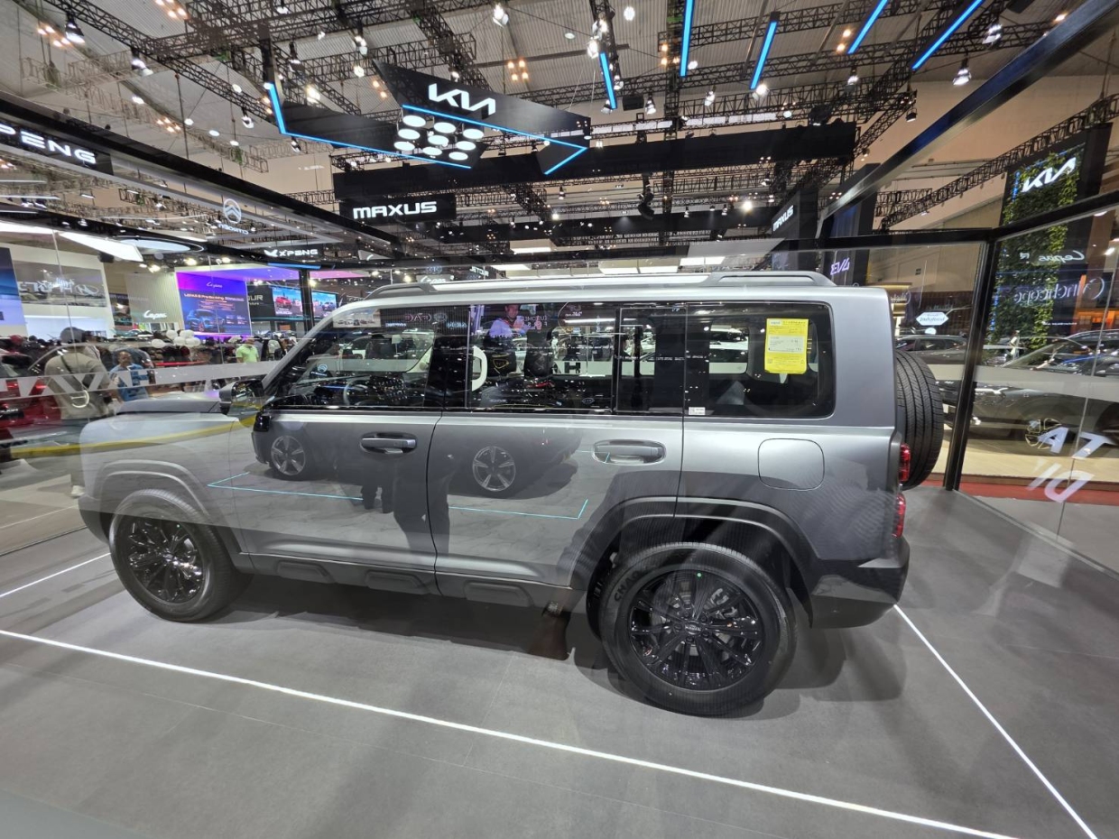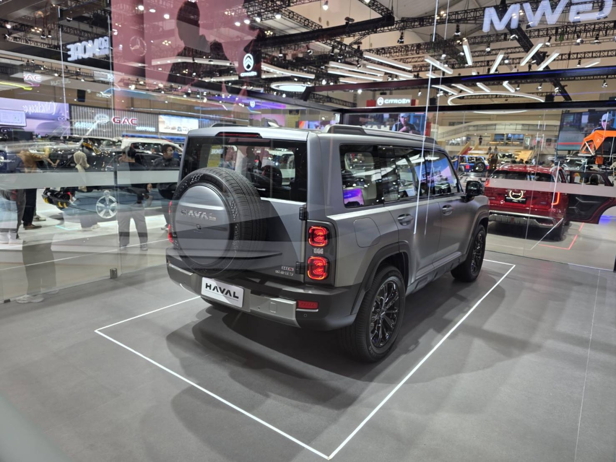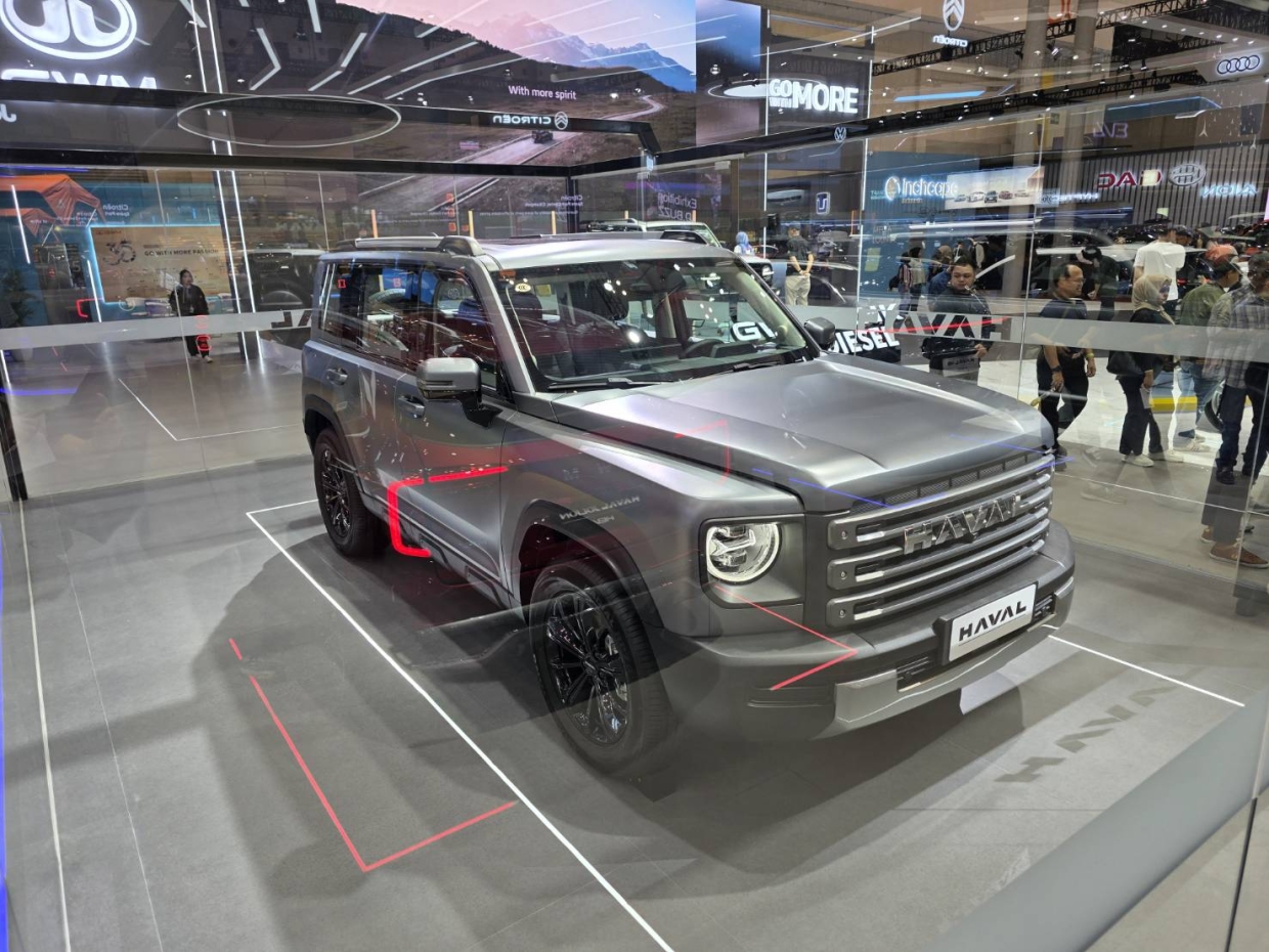 Haval Raptor จอดอยู่ในตู้กระจกภายในงาน เป็นรถ SUV ขับเคลื่อน 4 ล้อ สไตล์ออฟโรดขนาดกลาง ดีไซจ์นเหลี่ยมสัน ดุดัน พร้อมยางอะไหล่ติดท้ายแบบคลาสสิค มาพร้อม 2 ขุมพลัง ได้แก่ เครื่องยนต์เบนซินขนาด 2.0 ลิตร เทอร์โบ 238 แรงม้า และรุ่นเครื่องยนต์พลักอินไฮบริด PHEV ระบบ Hi4 กำลังรวมสูงสุด 383 แรงม้า
