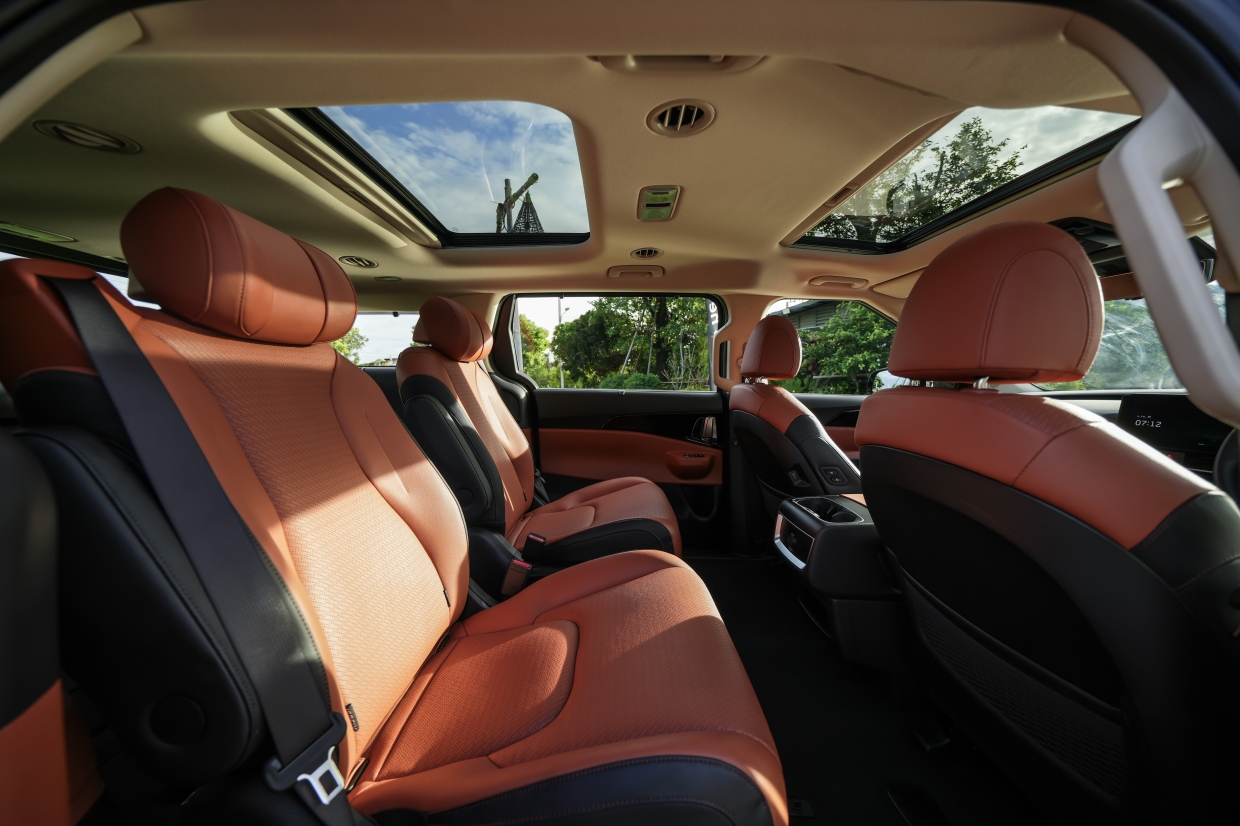 The New Kia Carnival HEV 7-Seater ยังคงโดดเด่นในเรื่องความกว้างขวางสำหรับทั้งผู้โดยสาร และสัมภาระ รวมถึงการปรับเปลี่ยนรูปแบบการจัดเรียงที่นั่งผู้โดยสารที่มีความยืดหยุ่น โดยถือเป็นรถเอมพีวีที่รองรับผู้โดยสารได้สูงสุด 7 ที่นั่ง พร้อมด้วยสัมภาระของทุกคนได้อย่างสะดวกสบายด้วยรถคันเดียว เบาะนั่งแถว 3 มาพร้อมฟังค์ชันพับราบ ที่เป็นการสร้างพื้นที่บรรทุกแบบเรียบที่รวดเร็ว และไม่ต้องใช้แรง ปรับเปลี่ยนได้ทันทีระหว่างความต้องการในการขนย้ายคน และขนส่งสินค้า