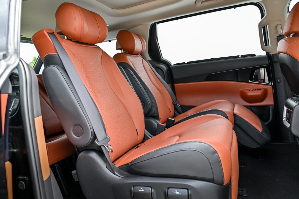 สำหรับเบาะที่นั่งของคนขับในรุ่น The New Kia Carnival HEV 7-Seat Luxury ยังได้ติดตั้งระบบจดจำตำแหน่งเบาะนั่งและระบบ Welcome Seat สำหรับผู้ขับ เบาะนั่งคู่หน้า และเบาะนั่งแถวที่ 2 มาพร้อมระบบระบายอากาศ และระบบอุ่นเบาะ สำหรับเบาะผู้โดยสารแถว 2 เป็นแบบ Relaxation Seat ที่เปลี่ยนทุกการเดินทางให้เป็นความสะดวกสบายระดับเฟิร์สต์คลาสส์ด้วยฟังค์ชันปรับเอนนอนที่สามารถปรับระดับได้เต็มรูปแบบ พร้อมเบาะรองขาแบบปรับไฟฟ้า มีโหมด One-Touch Relaxation ที่สั่งงาน