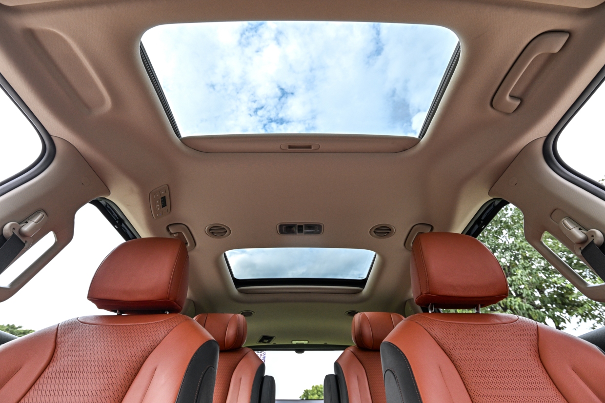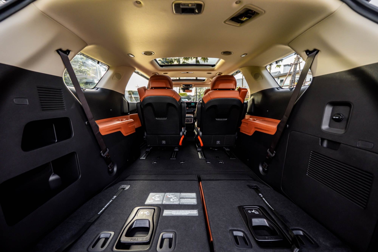 นอกจากนี้ ยังมีสวิทช์สำหรับสลับการควบคุมระบบอินโฟเทนเมนท์ และระบบปรับอากาศที่ผสานการควบคุมทั้งระบบไว้บนอินเตอร์เฟศเดียวกัน เพียงแค่สัมผัส 1 ครั้งก็สามารถสลับการควบคุมไปมาระหว่างระบบอินโฟเทนเมนท์กับระบบปรับอากาศ ช่วยลดความซับซ้อนของเลย์เอาท์ในขณะที่ยังคงความสะดวกในการใช้งาน และภายในห้องโดยสารยังได้ติดตั้งพอร์ท USB-C มาตรฐาน รวม 6 พอร์ทกระจายทั้ง 3 แถวที่นั่ง ช่วยให้ผู้โดยสารสามารถชาร์จอุปกรณ์ของตนได้อย่างสะดวกไม่ว่าจะนั่งอยู่ตำแหน่งใดของตัวรถ