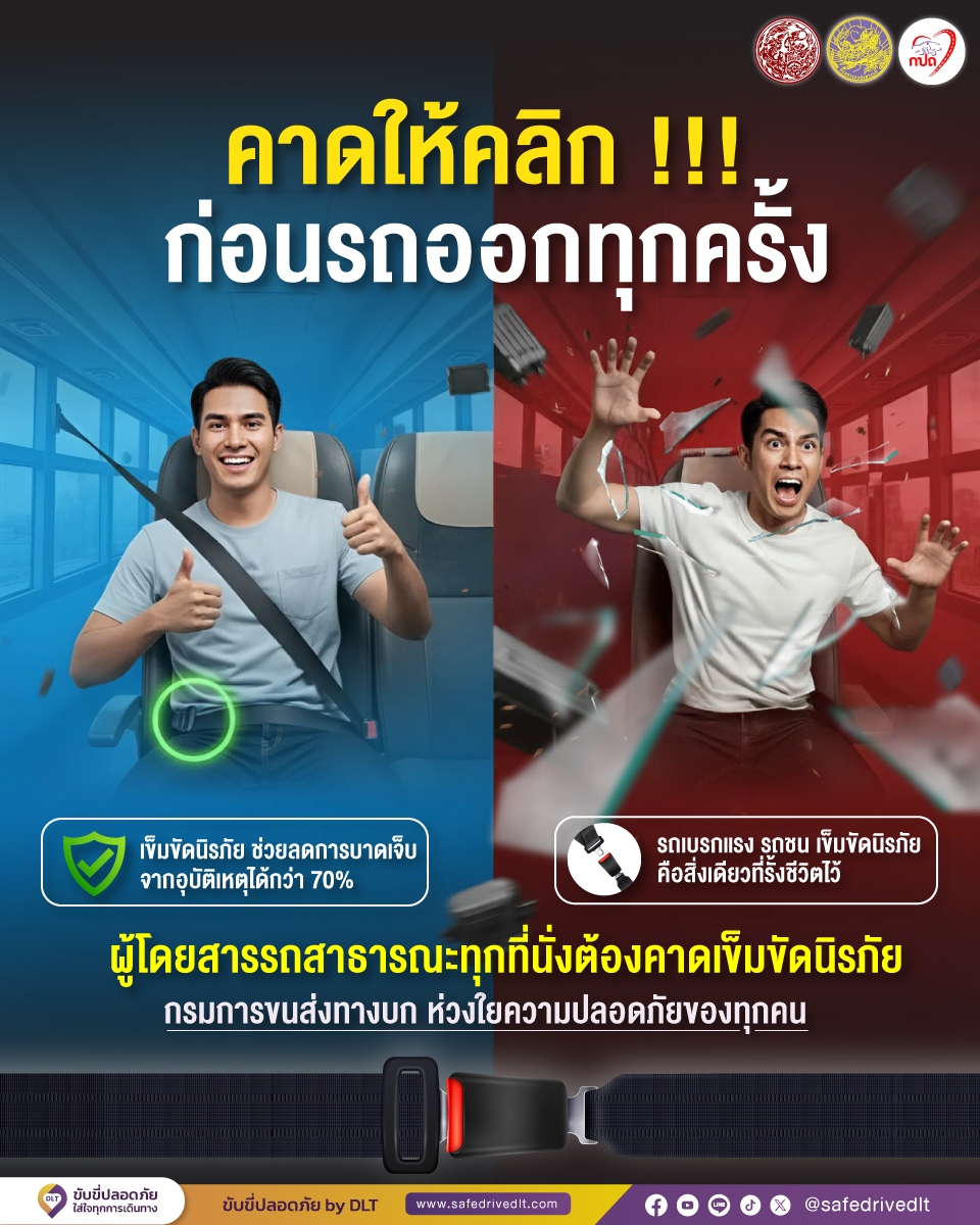 การคาดเข็มขัดนิรภัยไม่ใช่เพียงเรื่องของ “กฎหมาย” แต่คือ เรื่องของ “ชีวิต” ที่ทุกคนสามารถปกป้องได้ด้วยตนเอง เพราะในเสี้ยววินาทีของอุบัติเหตุ เข็มขัดนิรภัย คือ สิ่งเดียวที่ยึดชีวิตไว้ได้จริงจึงขอเชิญชวนประชาชนทุกคนร่วมเป็นส่วนหนึ่งของสังคมแห่งความปลอดภัย ด้วยการ “คาดเข็มขัดนิรภัยทุกครั้งที่นั่งรถโดยสาร” ไม่ว่าจะนั่งด้านหน้า ด้านหลัง หรือระยะทางใกล้ไกล เพื่อให้ทุกการเดินทางในช่วงเทศกาลกฐิน และฤดูกาลท่องเที่ยวปลายปี เต็มไปด้วยความสุข ความอุ่นใจ และความปลอดภัยถึงจุดหมายอย่างปลอดภัยทุกเส้นทาง