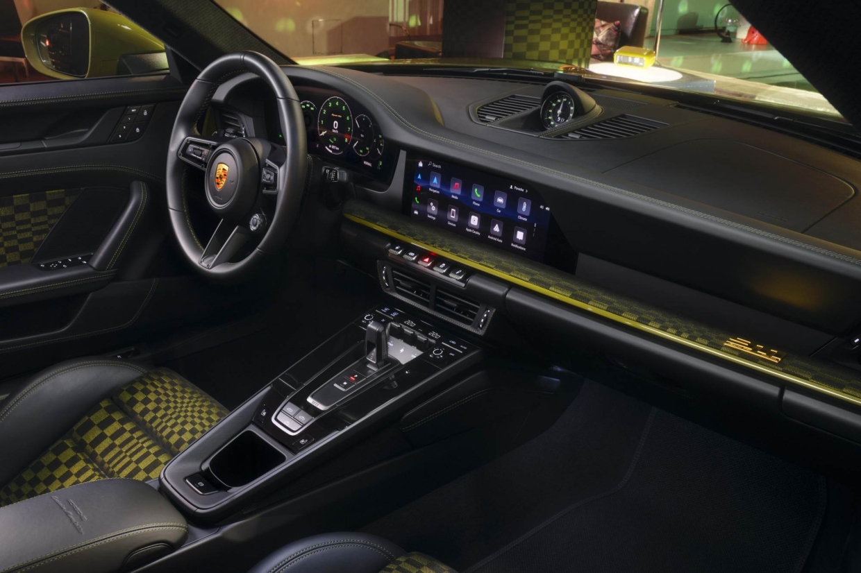 911 Spirit 70 มาพร้อมหลังคาผ้า และกรอบกระจกหน้าสีดำ ลายสามแถบสีดำแบบกึ่งด้านบนฝากระโปรงหน้า ที่ได้รับแรงบันดาลใจจากสติคเกอร์ความปลอดภัยในยุค 1970 และหลังคาผ้าสีตัดกับตัวถัง พร้อมตราสัญลักษณ์ Porsche ที่ใช้การออกแบบใกล้เคียงกับสัญลักษณ์ดั้งเดิมในปี 1963 เสริมความพิเศษด้วยตัวอักษรสีทอง พร้อมอักษร “Porsche Exclusive Manufaktur” บนซุ้มล้อหน้า
