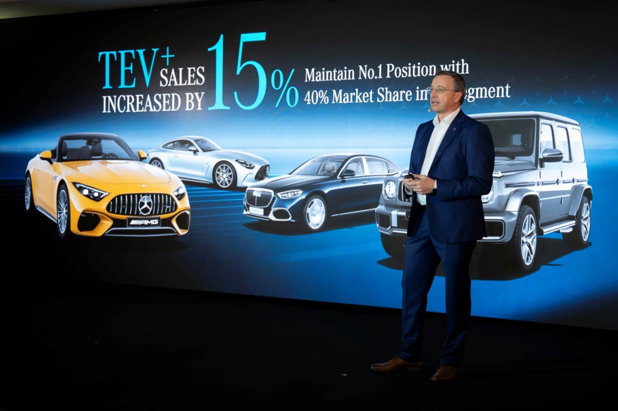 โดยในปี 2568 ที่ผ่านมา ถือเป็นปีที่สะท้อนให้เห็นถึงการเปลี่ยนผ่านเข้าสู่ยุคของรถยนต์พลังงานไฟฟ้าอย่างชัดเจน อ้างอิงจากการเติบโตของยอดขายรถยนต์พลังงานไฟฟ้า 100 % และรถยนต์พลัก-อิน ไฮบริดของแบรนด์ โดยในส่วนของรถยนต์ระดับ Top-End Luxury (TEV+) มีการเปิดตัวเพิ่มเติมถึง 4 รุ่น ได้แก่ Mercedes-AMG SL 55, Mercedes-AMG GT 63, Mercedes-AMG G 63 และ G 450 D Edition Stronger than the 1980s ซึ่งสอดคล้องกับทเรนด์การเติบโตในระดับโลกของแบรนด์ Mercedes-AMG และโมเดลระดับตำนานอย่าง G-Class
