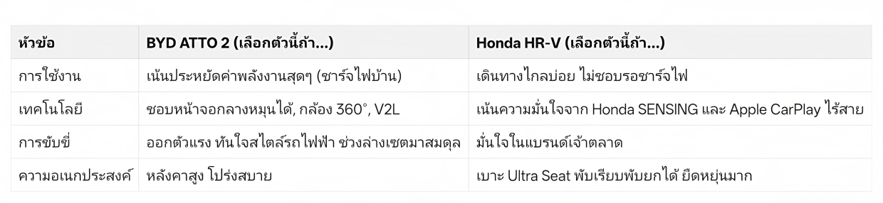 ถ้าคุณมีที่ชาร์จที่บ้านและเน้นความล้ำสมัยในราคาที่ "ถูกกว่า" เกือบ 2-3 แสนบาท BYD Atto 2 คือผู้ชนะในแง่ความคุ้มค่าครับ แต่ถ้าคุณเน้นความอุ่นใจในการเดินทางไกล ศูนย์บริการที่มีทุกหัวเมือง และราคาขายต่อที่นิ่งกว่า Honda HR-V ยังคงเป็นคำตอบที่มั่นคงกว่า