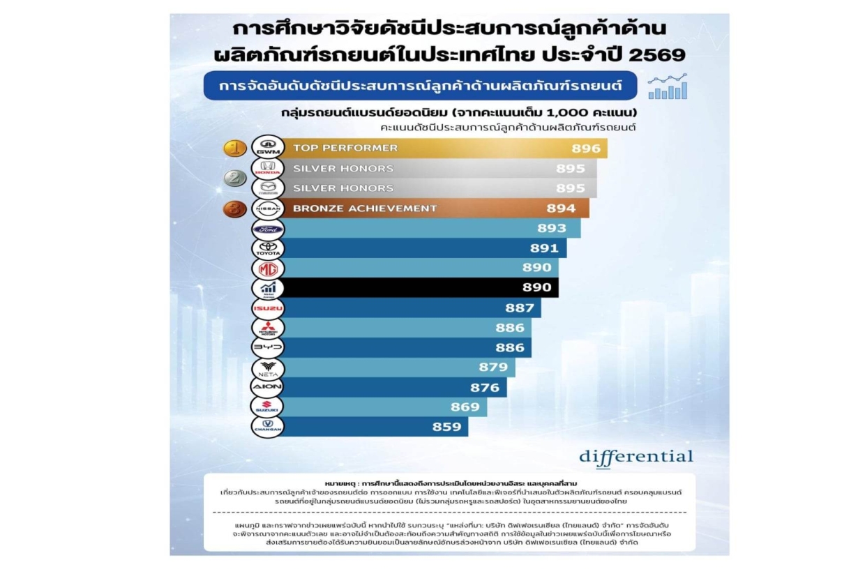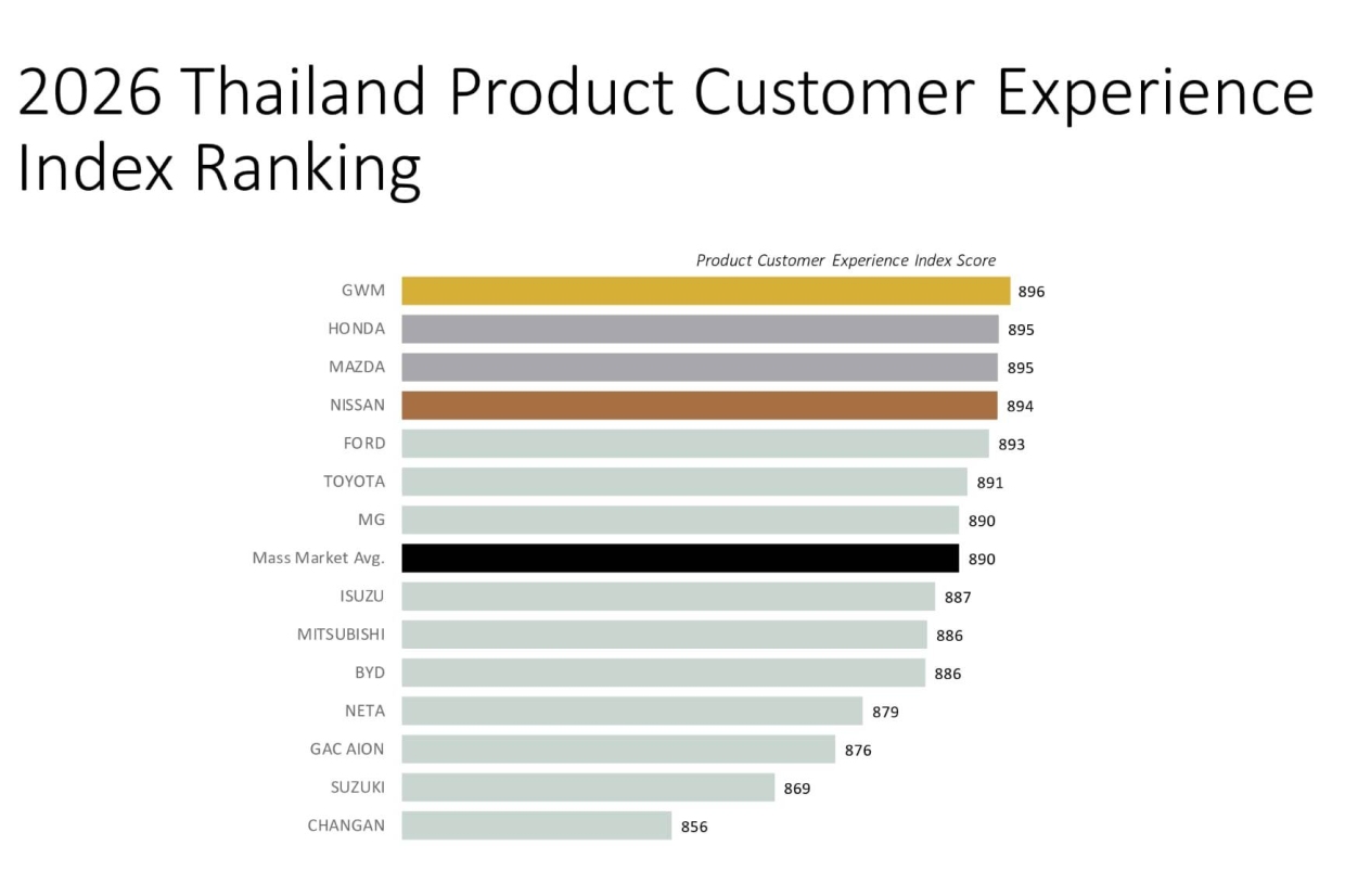 ศิรส สาตราภัย กรรมการผู้จัดการ Differential ประจำประเทศไทย เปิดเผยว่า ผลการศึกษาวิจัย “ประสบการณ์ลูกค้าด้านผลิตภัณฑ์รถยนต์ในประเทศไทย” หรือ “Product Customer Experience Index (Product CXI) Study℠” ในครั้งนี้เราพบว่า เจ้าของรถในกลุ่ม GWM มีความพึงพอใจเฉลี่ยสูงสุด และครองอันดับ 1 ด้วยคะแนน 896 คะแนนจากคะแนนเต็ม 1,000 คะแนน รองลงมา คือ Honda และ Mazda (ได้ 895 คะแนนเท่ากัน) Nissan (ได้ 894 คะแนน) Ford (ได้ 893 คะแนน) และ Toyota (ได้ 891 คะแนน) โดยทุกยี่ห้อที่กล่าวมา มีคะแนนสูงกว่าค่าเฉลี่ยของอุตสาหกรรมซึ่งอยู่ที่ 890 คะแนน ขณะที่ MG ได้ 890 คะแนนซึ่งอยู่ที่ระดับค่าเฉลี่ย ส่วนแบรนด์อื่นๆ ได้คะแนนต่ำกว่าค่าเฉลี่ยของอุตสาหกรรม