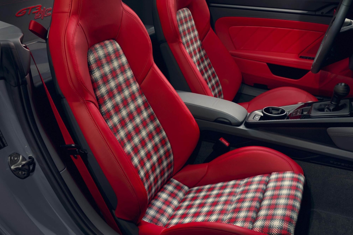 ภายในห้องโดยสารประกอบด้วยเบาะ Adaptive Sports Seats Plus โดดเด่นด้วยลายปักเส้นขอบสัญลักษณ์ Porsche เบาะส่วนกลางหุ้มด้วยหนังถัก 4 โทนสี ได้แก่ Slate Grey, Guards Red, Magnesium Grey และ Kalahari และวัสดุที่ผลิตอย่างประณีตนี้ยังตกแต่งอยู่บริเวณช่องเก็บของด้านหน้า นอกจากนี้ ห้องโดยสารยังหุ้มด้วยหนังทูโทนสี Slate Grey และ Guards Red แทบทั้งบริเวณห้องโดยสาร พร้อมตะเข็บตกแต่ง ห่วงมือจับประตู มือจับเบาะ และเข็มขัดนิรภัยในสี Guards Red ที่ตัดกับโทนภายในอย่างชัดเจน