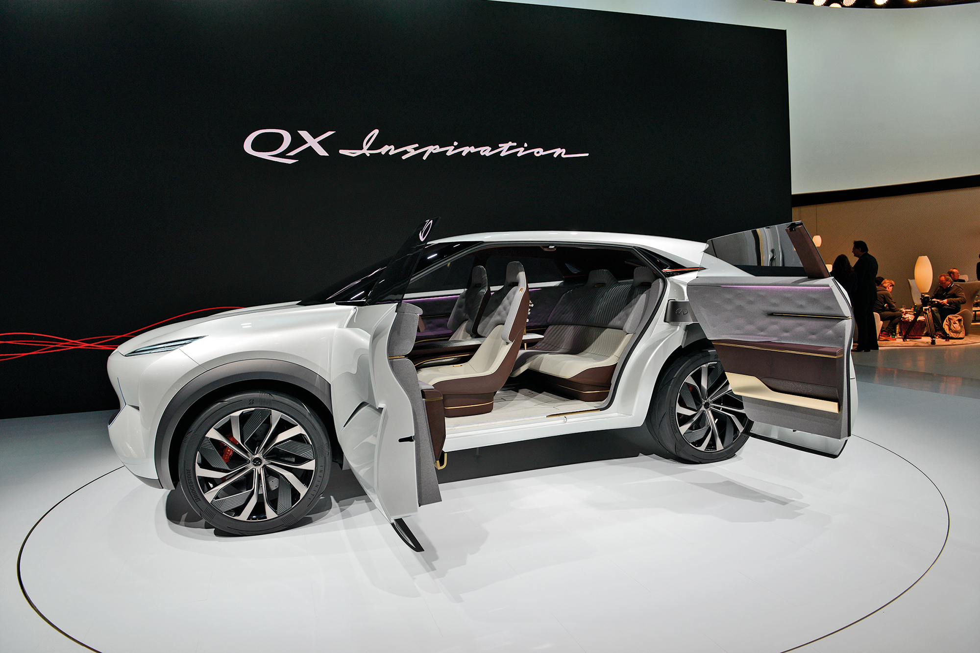 รถแนวคิดสายเลือดซามูไรอีกคันหนึ่งซึ่งอวดตัว "ครั้งแรกในโลก" ที่งานนี้ คือ อินฟินิที คิวเอกซ์ อินสไปเรชัน (INFINITI QX INSPIRATION) ซึ่งเป็นจุดโฟคัสความสนใจในบูธของผู้ผลิตรถยนต์ญี่ปุ่นที่มีสำนักงานใหญ่อยู่ในฮ่องกง เป็นรถแนวคิดในรูปลักษณ์ของรถกิจกรรมกลางแจ้งขนาดกลาง ซึ่งบ่งบอกทิศทางของรถกิจกรรมกลางแจ้งพลังไฟฟ้าที่ค่ายนี้ตั้งใจจะผลิตจำหน่ายเป็นแบบแรก ตัวถังยาว 4.650 ม. และสูง 1.630 ม. ออกแบบได้ดี ถ้ามีคะแนนก็ต้องให้เต็ม 10 รูปทรงองค์เอวตัวถังดูสะอาดเกลี้ยงเกลาไม่มีสันไม่มีครีบที่จะสะดุดการไหลของกระแสลม ประตูข้างที่เปิดแยกจากกันโดยไม่มีเสาค้ำยันกลางช่วยให้การขึ้นลงรถทำได้โดยสะดวก ภายในห้องโดยสารก็ออกแบบได้อย่างวิลิศมาหรา และได้ความรู้สึก มีระบบแสงที่ทำให้เปลี่ยนได้ถึง 4 สี คือ สีเขียวอ่อน สีเหลืองละมุน สีชมพู และสีม่วง ที่น่าชื่นชม และทำให้เป็นรถสะอาดที่แท้จริง คือ ระบบขับทุกล้อไร้ไอเสียซึ่งติดตั้งมอเตอร์ไฟฟ้า 2 ชุด ชุดหนึ่งขับล้อคู่หน้า อีกชุดขับล้อคู่หลัง