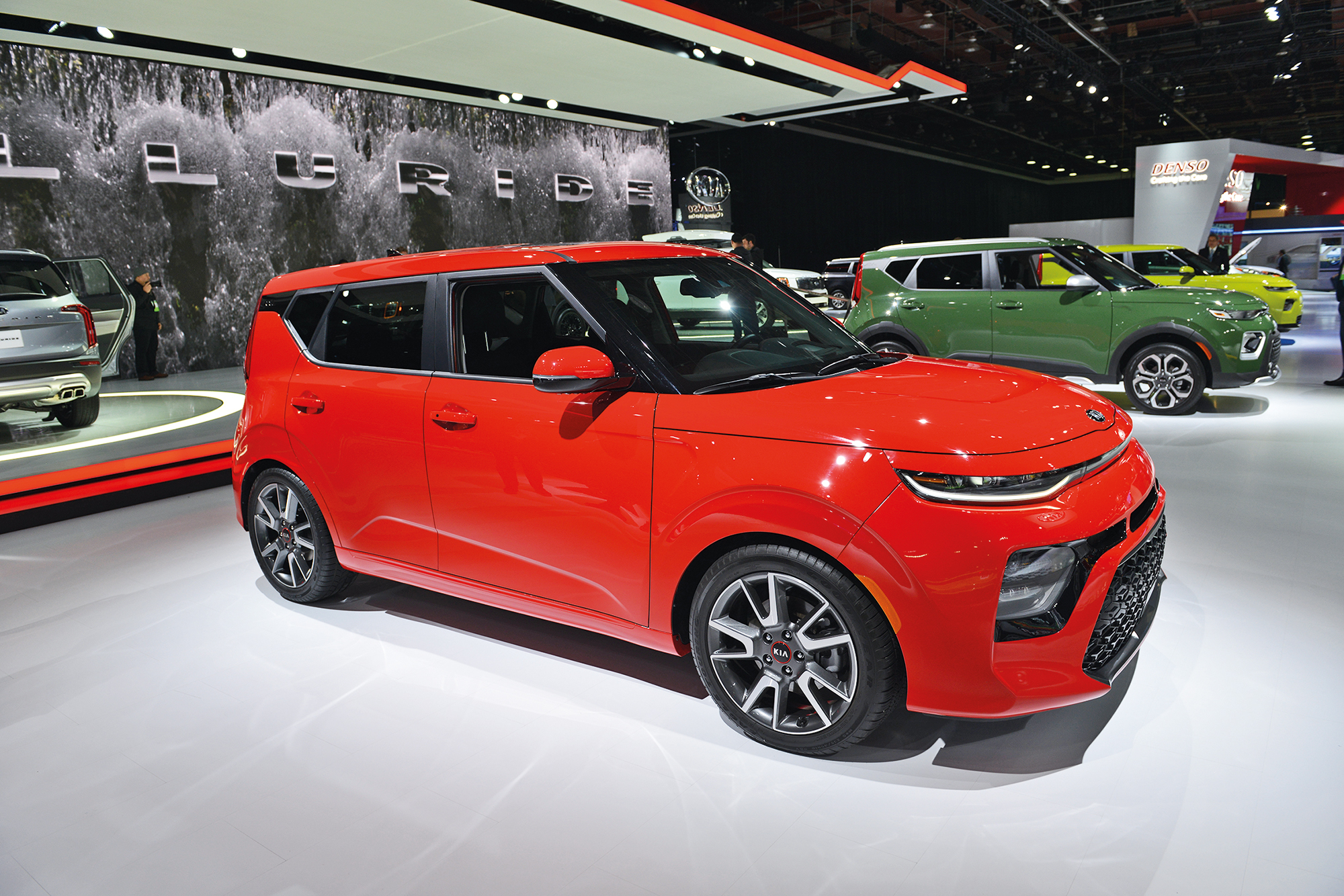 รถใหม่อีกแบบหนึ่งซึ่งปรากฏตัว "ครั้งแรกในโลก" ที่งานมหกรรมยานยนต์ลอสแองเจลิส ครั้งล่าสุดเมื่อปลายเดือนพฤศจิกายน 2018 และฉายซ้ำ 2 ที่งานนี้ คือ เกีย โซล (KIA SOUL) รุ่นใหม่ ซึ่งขณะพิมพ์รายงานนี้เริ่มการจำหน่ายในเมืองโสมไปแล้วพร้อมกับป้ายชื่อ เกีย โซล บูสเตอร์ (KIA SOUL BOOSTER) แต่ในเมืองมะกันยังต้องรออีกหน่อย นับเป็นรถรุ่นที่ 3 และเป็นรถที่ออกแบบขึ้นใหม่ทั้งหมด ตัวถังมีขนาด 4.196x1.800x1.600 ม. คือ ยาวขึ้น 5.6 ซม. แต่กว้าง และสูงเท่าเดิม รูปทรงองค์เอวดูแล้วฟันธงได้เลยว่า ผู้ออกแบบยังอาลัยอาวรณ์รถรุ่นเดิมอยู่มาก จะเริ่มการจำหน่ายในฐานะรถรุ่นปี 2020 และจะมีเครื่องยนต์ให้เลือก 2 ขนาด คือ เครื่องเบนซิน 4 สูบเรียง 2.0 ลิตร 110 กิโลวัตต์/147 แรงม้า ส่งกำลังผ่านเกียร์ธรรมดา 6 จังหวะ หรือเกียร์อัตโนมัติ CVT กับเครื่องเทอร์โบดีเซลฉีดตรง 4 สูบเรียง 1.6 ลิตร 150 กิโลวัตต์/201 แรงม้า ทำงานร่วมกับเกียร์คลัทช์คู่ 7 จังหวะ