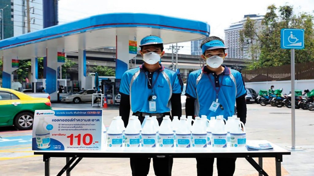 สถานีบริการน้ำมัน พีทีที สเตชัน จำหน่ายแอลกอฮอลความเข้มข้น 70 % สำหรับทำความสะอาดมือโดยไม่ต้องล้างออก ให้ผู้บริโภคในเขตกรุงเทพมหานคร และปริมณฑล ในราคาทุน ชนิดน้ำ บรรจุขวด (ขวดละ 1 ลิตร) จำหน่ายขวดละ 110 บาท ส่วนเจลแอลกอฮอลบรรจุถุง (ถุงละ 500 มิลลิลิตร) จำหน่ายถุงละ 40 บาท