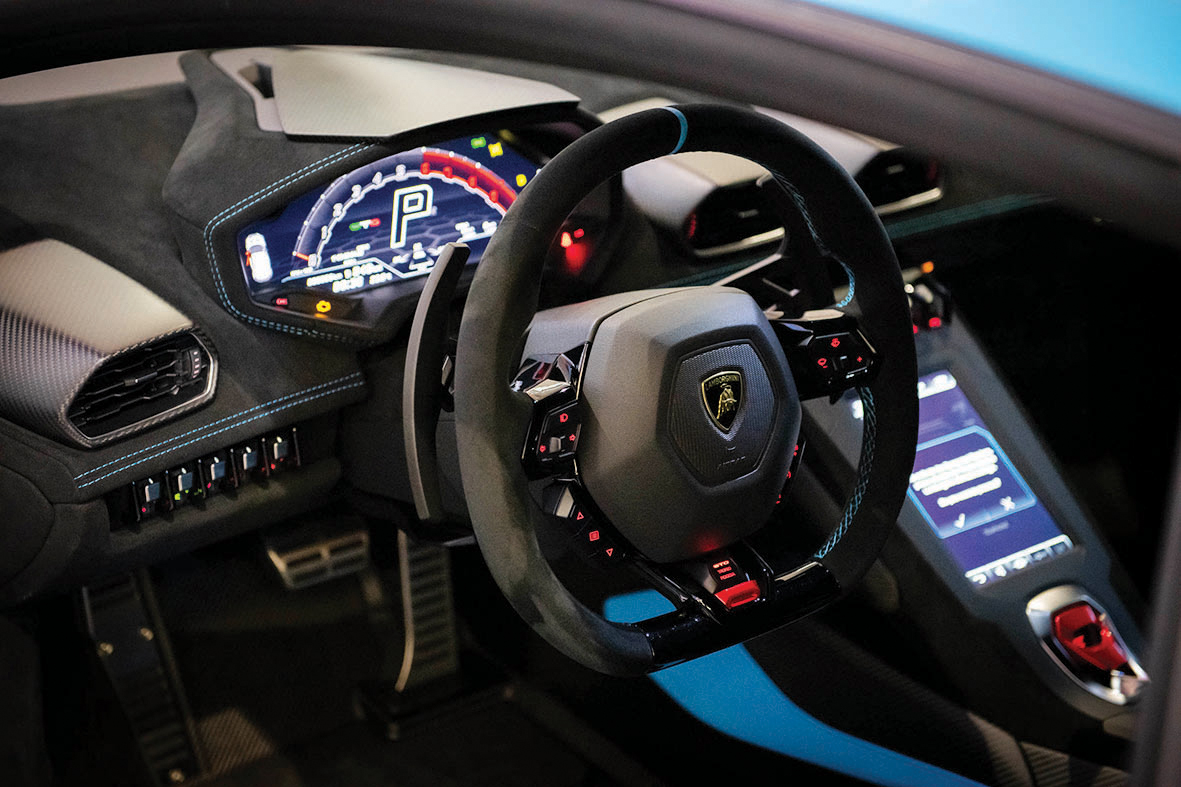 ขณะที่ห้องโดยสารมีกลิ่นอายของตัวแข่งเช่นกัน ตกแต่งด้วยวัสดุคาร์บอนไฟเบอร์ เบาะนั่งแบบสปอร์ทพร้อมส่วนพนักพิงหลังใช้วัสดุคาร์บอนไฟเบอร์เช่นกัน ผสมกับหนังแท้ชั้นดี เข็มขัดนิรภัยแบบ 4 จุดยึด ใกล้เคียงกับรถแข่งขนานแท้ บริเวณใต้ฝากระโปรงหน้าถูกออกแบบให้สามารถบรรจุหมวกนิรภัยได้ (ในกรณีที่ผู้เป็นเจ้าของนำรถไปวาดลวดลายในสนามแข่ง !) นอกจากนี้การแสดงผลบนแผงหน้าปัดยังคงใช้รูปแบบเดียวกันกับ HURACAN EVO (อูรากัน เอโว) เรียกได้ว่าเป็นการออกแบบที่ผสมผสานระหว่างความดิบห้าวแบบตัวแข่ง และการใช้งานที่มีความสะดวกสบายเช่นกัน