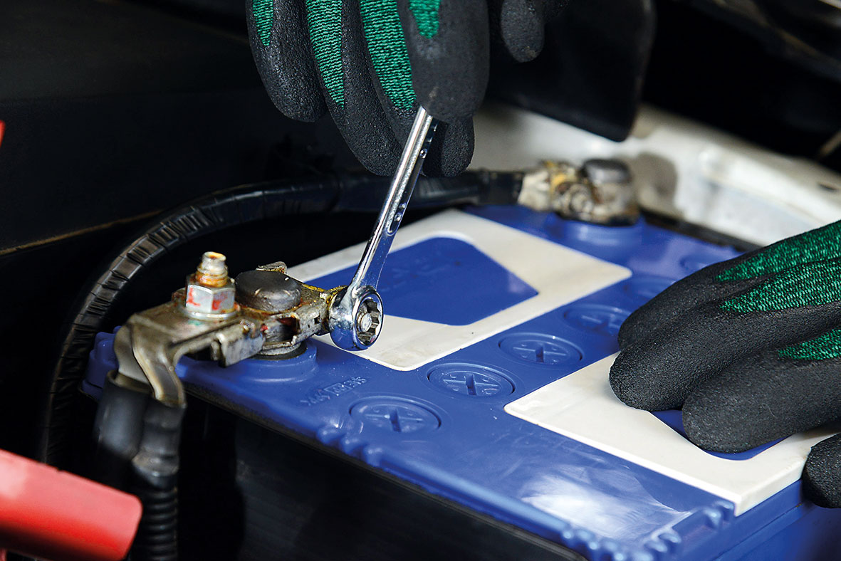 1. นำประแจเบอร์ 10 คลายนอทเหล็กยึดแบทเตอรีออกเสียก่อน