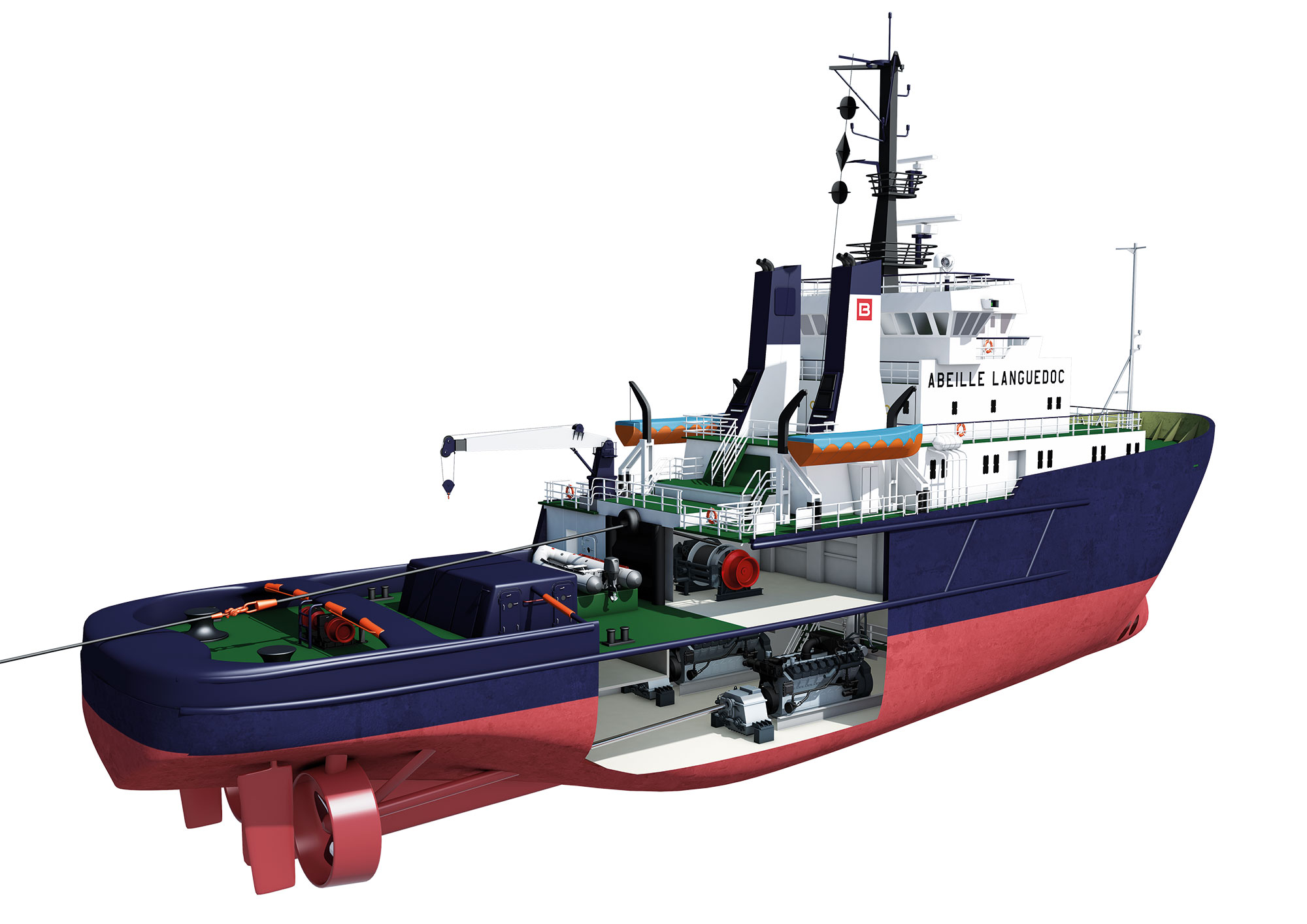เรือลากจูงกู้ภัย มีความแข็งแกร่ง หากเทียบกับความยาว 20-30 ม. ของมัน ตัวเรือมีเครื่องยนต์ขนาดใหญ่ที่สัมพันธ์กับขนาด เมื่อรวมกับใบพัดที่กว้างแล้ว แม้จะเคลื่อนที่ได้ช้า แต่ก็มีแรงขับสูงมาก
