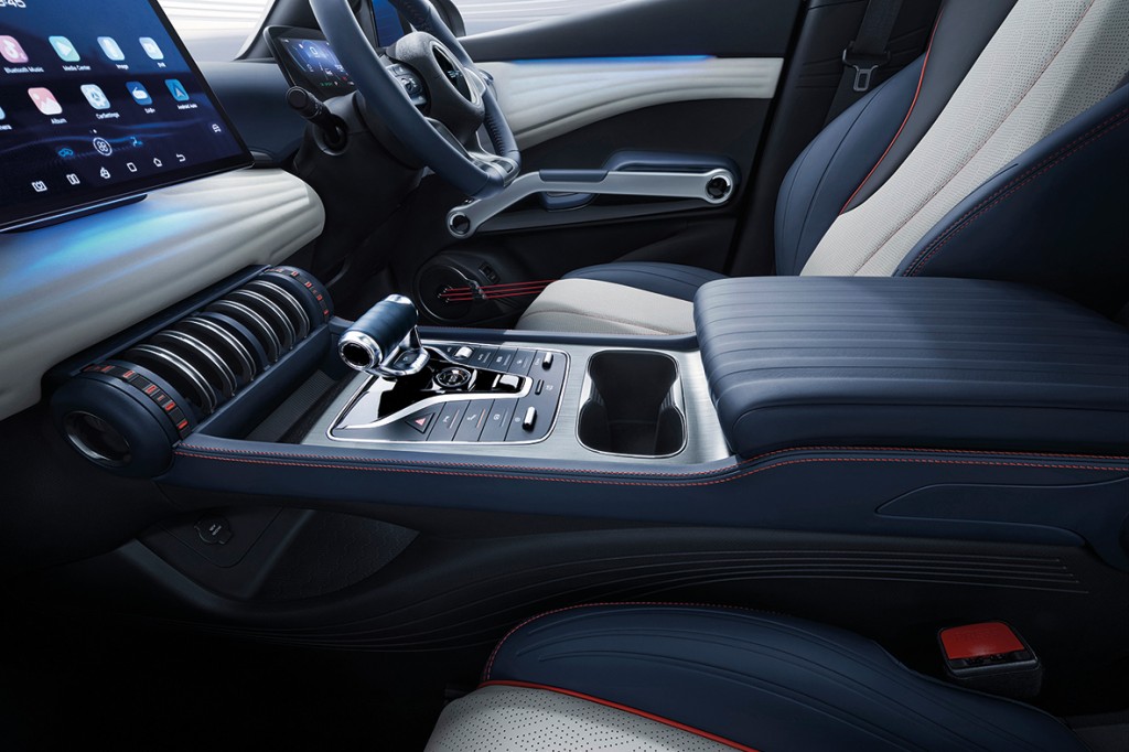 ภายในห้องโดยสารแปลกตา จอทัชสกรีนสำหรับแสดงผลระบบอินโฟเทนเมนท์ขนาด 12.8 นิ้ว สามารถปรับเป็นแนวนอน หรือแนวตั้ง มาตรวัดแบบดิจิทอลขนาด 5 นิ้ว จุดชาร์จสมาร์ทโฟนแบบไร้สาย และระบบเสียงพร้อมลำโพง 8 ตำแหน่ง