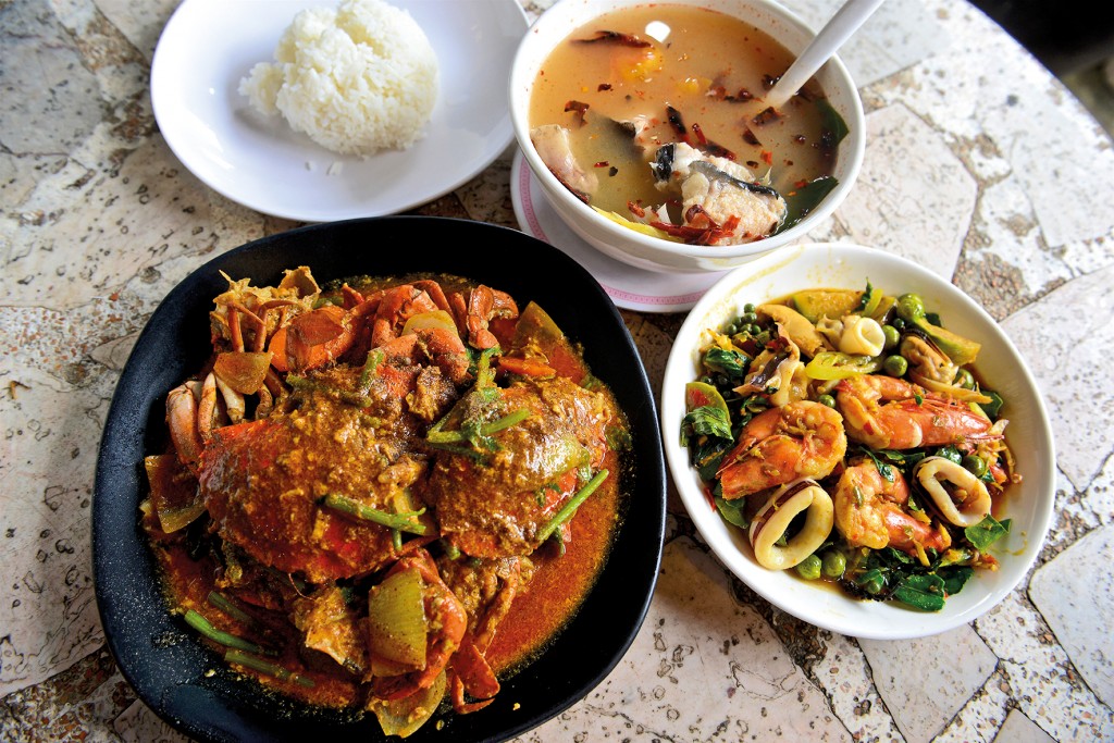 หากใครมาที่หมู่บ้านอีต่อง แนะนำให้ลองมาชิมอาหารร้าน “ครัวเจ๊ณี” เนื่องจากเป็นร้านชื่อดังของที่นี่ อาหารขึ้นชื่อส่วนใหญ่เป็นปูทะเลสดๆ และอาหารทะเลจากประเทศเมียนมาร์ นอกจากนี้ ยังมีเมนูพื้นบ้านให้ได้ลองชิมกัน เราสั่ง “ปูดำผัดผงกะหรี่” “ต้มยำปลาคัง” และ “ผัดฉ่าทะเล” อาหารที่นี่อร่อย รสจัด และราคาถูก ใครผ่านมาไปลองชิมกันได้
