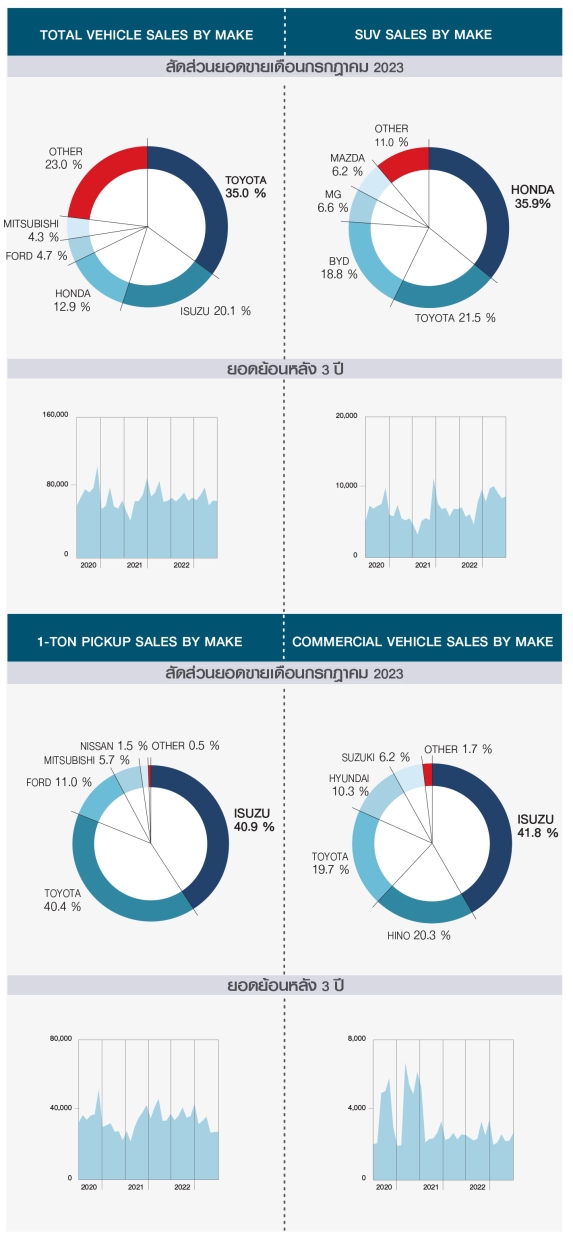 ปี 2566 ผ่านไปแล้ว 7 เดือน ตัวเลขยอดจำหน่ายรถยนต์ใหม่มีรวมกันทั้งสิ้น 464,550 คัน เทียบกับช่วงเดียวกันของปี 2565 แล้วตัวเลขลดน้อยลง 26,779 คัน หรือลดลง 5.5 % 5 อันดับรถยนต์ที่มียอดจำหน่ายสะสมมากที่สุด ประกอบด้วย อันดับ 1 TOYOTA จำหน่ายไปแล้วรวม 157,280 คัน ลดลง 5,029 คัน หรือลดลง 3.1 % เมื่อเทียบกับช่วงเดียวกันของปี 2565 ส่วนแบ่งการตลาด 33.9 % อันดับ 2 ISUZU 99,016 คัน ลดลง 28,155 คัน หรือลดลง 22.3 % ส่วนแบ่งการตลาด 21.1 % อันดับ 3 HONDA 53,685 คัน เพิ่มขึ้น 6,268 คัน หรือเพิ่มขึ้น 13.2 % ส่วนแบ่งการตลาด 11.6 % อันดับ 4 FORD 22,882 คัน เพิ่มขึ้น 4,342 คัน หรือเพิ่มขึ้น 23.4 % ส่วนแบ่งการตลาด 4.9 % และอันดับ 5 MITSUBISHI 22,340 คัน ลดลง 9,085 คัน หรือลดลง 28.9 % ส่วนแบ่งการตลาด 4.8 %