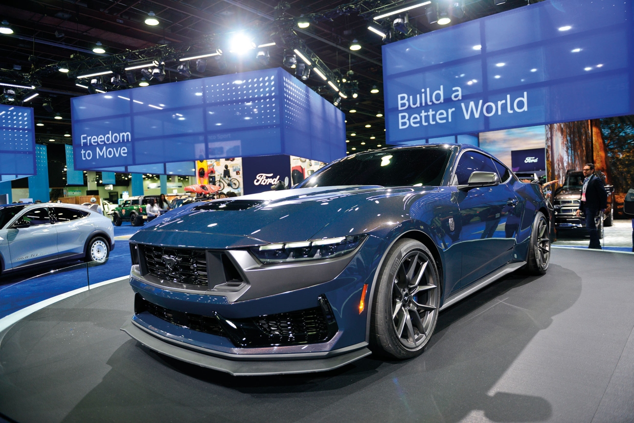 รถม้าป่าอีกคันที่ปรากฏตัวในบูธของค่าย “วงรีสีฟ้า” คือ FORD MUSTANG DARK HORSE PREMIUM (ฟอร์ด มัสแตง ดาร์ค ฮอร์ส พรีเมียม) ซึ่งเป็นโมเดลหัวกะทิของรถ FORD MUSTANG รุ่นปัจจุบัน ที่เปิดตัวเมื่อกลางปี 2022 และเพิ่งเริ่มการจำหน่ายในฐานะรถรุ่นปี 2024 ที่แตกต่างจากรถอนุกรมเดียวกันโมเดลอื่นๆ (MUSTANG ECOBOOST-MUSTANG ECOBOOST PREMIUM-MUSTANG GT PREMIUM) ก็คือ รถหัวกะทิโมเดลนี้ไม่มีตัวถังเปิดประทุน มีแต่ตัวถังคูเปซึ่งติดป้ายค่าตัว 63,265 เหรียญ หรือประมาณ 2.28 ล้านบาทไทย รถคูเป 4 ที่นั่งโมเดลนี้ มีขนาดตัวถัง 4.818x1.918x1.402 ม. มีช่วงฐานล้อ 2.718 ม. และมีน้ำหนักรถพร้อมขับ 1,811 กก. ติดตั้งเครื่องยนต์เบนซินหายใจอากาศธรรมดา DOHC วี 8 สูบ 5.0 ลิตร ที่ให้กำลังสูงถึง 373 กิโลวัตต์/500 แรงม้า และถ่ายทอดกำลังสู่ล้อคู่หลังผ่านระบบเกียร์ธรรมดา 6 จังหวะ TREMEC หรือเกียร์อัตโนมัติ 10 จังหวะ SELECTSHIFT