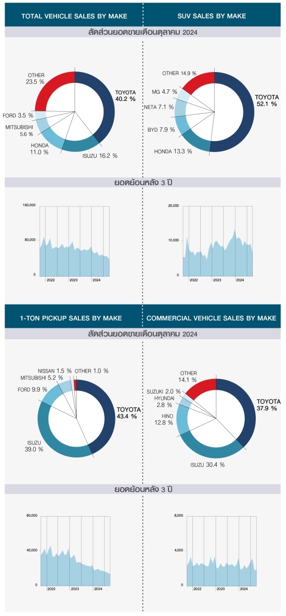 ตัวเลขยอดจำหน่ายรถยนต์ใหม่ของเดือนตุลาคม 2567 เพียงแค่ 37,691 คันเท่านั้น เทียบกับเดือนตุลาคม 2566 แล้วเป็นตัวเลขยอดจำหน่ายที่ลดลงถึง 21,272 คัน หรือลดลง 36.1 % ซึ่งในบรรดารถยนต์ที่มียอดจำหน่ายสูงสุดมีเพียง MITSUBISHI (มิตซูบิชิ) เพียงรายเดียวเท่านั้น ที่มีตัวเลขยอดจำหน่ายเพิ่มขึ้นกว่าที่เคยทำไว้ โดย TOYOTA (โตโยตา) ยังคงยืนหนึ่งได้รับความนิยมสูงสุด เดือนตุลาคมจำหน่ายได้อีก 15,162 คัน แต่ถ้าเทียบกับที่เคยทำได้ในเดือนตุลาคม 2566 แล้วเป็นยอดจำหน่ายที่ลดลงไป 5,690 คัน หรือจำหน่ายได้น้อยลง 27.3 % ส่วนแบ่งการตลาดเดือนตุลาคม 2567 อยู่ที่ 40.2 % ISUZU (อีซูซุ) ได้รับความนิยมอยู่ในอันดับ 2 จากยอดจำหน่าย 6,092 คัน เป็นยอดจำหน่ายที่ลดลง 4,870 คัน หรือลดลง 44.4 % เมื่อเทียบกับเดือนตุลาคม 2566 ส่วนแบ่งการตลาดเดือนนี้ 16.2 % อันดับ 3 ค่าย HONDA (ฮอนดา) จำหน่ายได้ 4,137 คัน ลดลง 3,169 คัน หรือลดลง 43.4 % ส่วนแบ่งการตลาด 11.0 % อันดับ 4 MITSUBISHI จำหน่ายได้ 2,129 คัน เพิ่มขึ้นจากเดือนตุลาคม 2566 ถึง 401 คัน หรือเพิ่มขึ้น 23.2 % ส่วนแบ่งการตลาด 5.6 % และอันดับ 5 ค่าย FORD (ฟอร์ด) ทำยอดจำหน่ายได้ 1,316 คัน ลดลง 1,227 คัน หรือลดลง 48.3 % ส่วนแบ่งการตลาด 3.5 %
