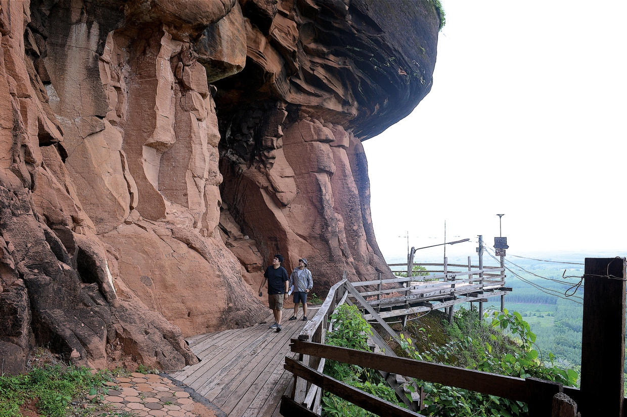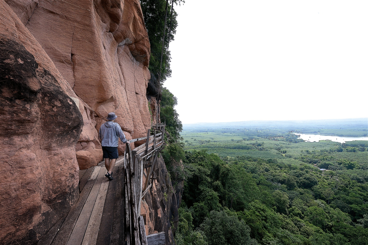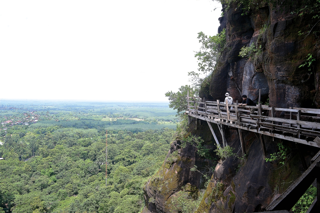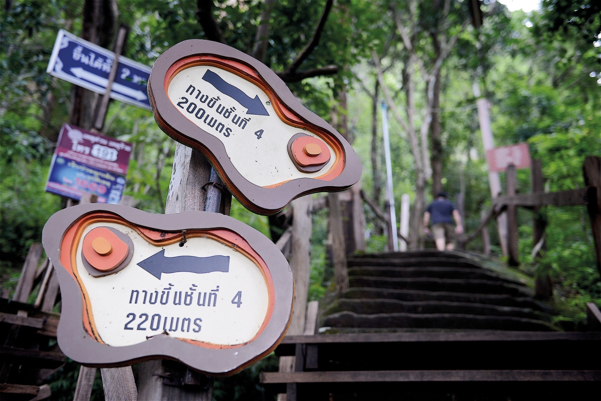 สิ่งที่ถือเป็นไฮไลท์ของที่นี่ คือ การเดินเท้าชมธรรมชาติที่อุดมสมบูรณ์ ด้วยทางเดินสะพานไม้ที่วนเวียนไต่ระดับขึ้นสู่ยอดภู ที่สร้างขึ้นจากแรงศรัทธาของพระ เณร และชาวบ้านในพื้นที่ โดยเริ่มก่อสร้างตั้งแต่ปี 2512 ใช้เวลาสร้างนานถึง 5 ปี แบ่งออกเป็น 7 ชั้น ซึ่งชั้นที่ 1-2-3 เป็นสะพานไม้วนรอบเขา มีเส้นทางลัดขึ้นสู่ชั้น 5 แต่สภาพเส้นทางชันมาก ถ้าร่างกายไม่พร้อม ยอมเสียเวลาเดินวนดีกว่า