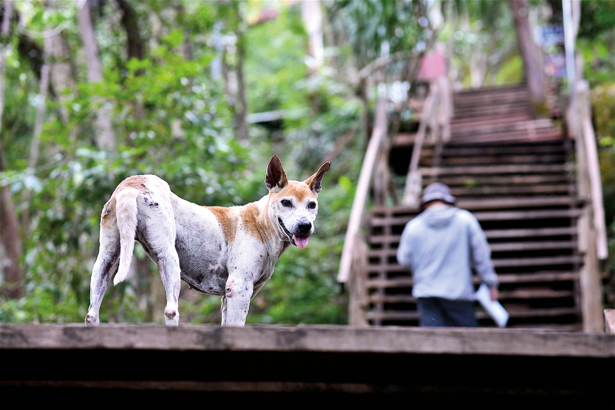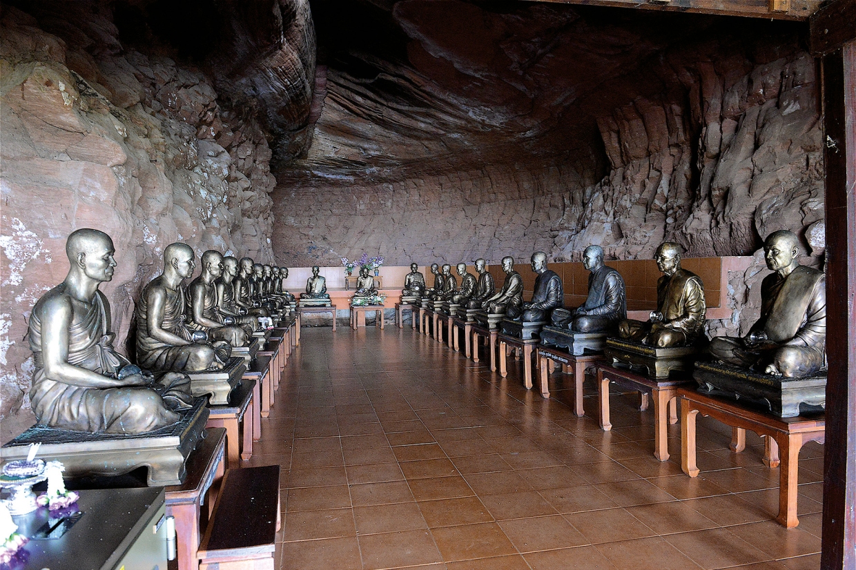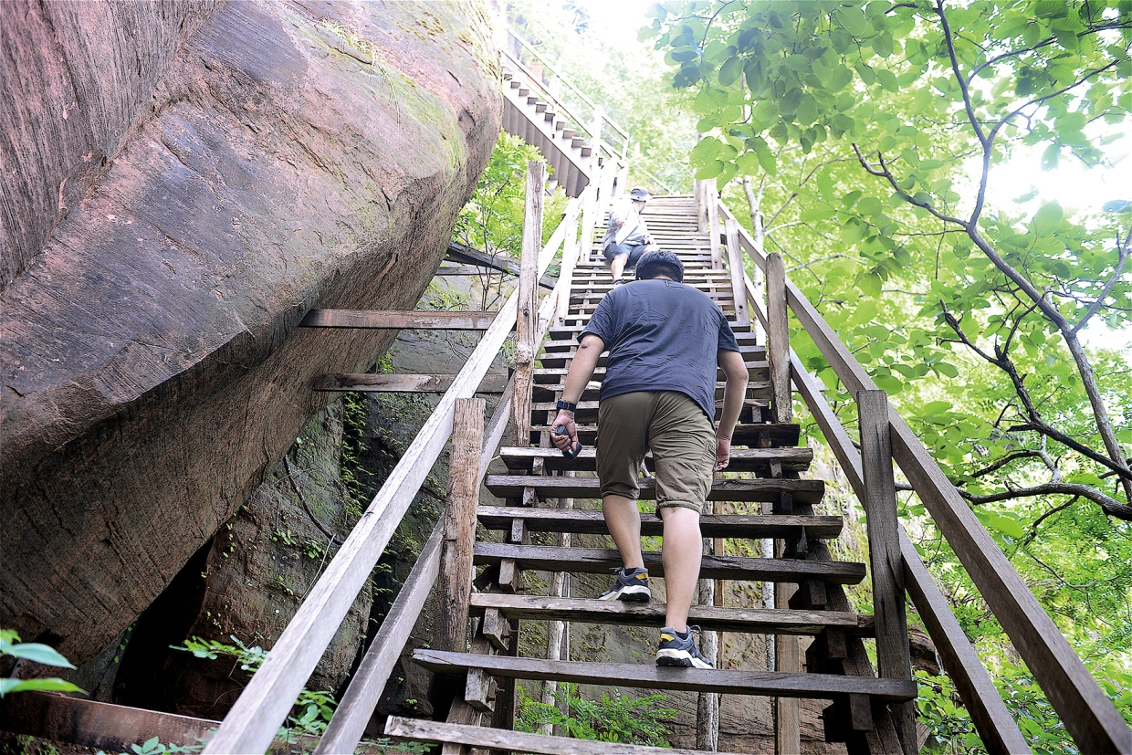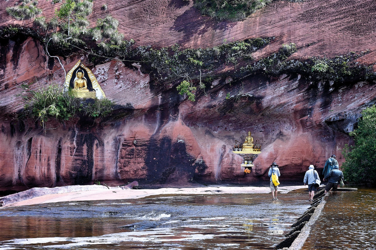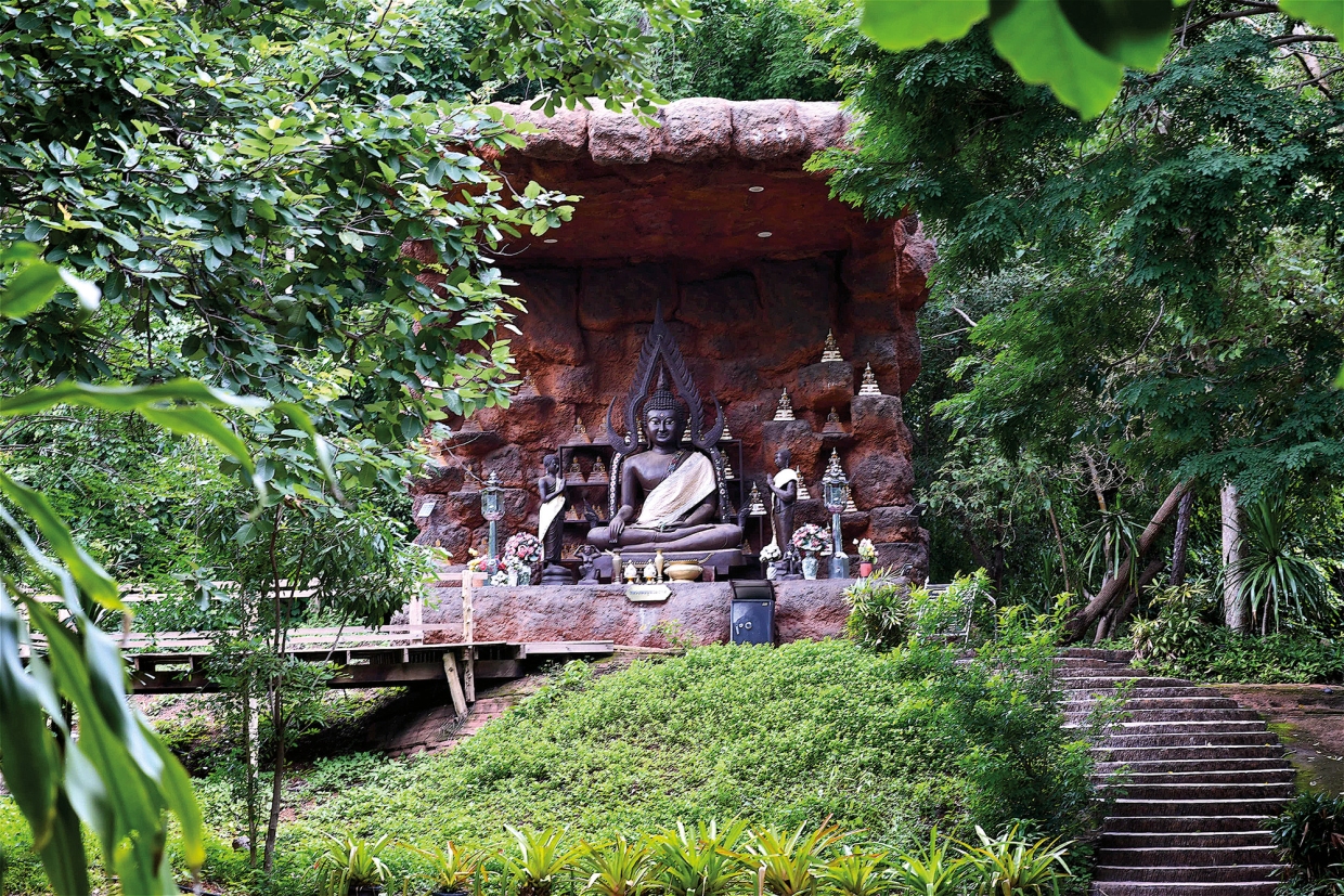 สิ่งที่ถือเป็นไฮไลท์ของที่นี่ คือ การเดินเท้าชมธรรมชาติที่อุดมสมบูรณ์ ด้วยทางเดินสะพานไม้ที่วนเวียนไต่ระดับขึ้นสู่ยอดภู ที่สร้างขึ้นจากแรงศรัทธาของพระ เณร และชาวบ้านในพื้นที่ โดยเริ่มก่อสร้างตั้งแต่ปี 2512 ใช้เวลาสร้างนานถึง 5 ปี แบ่งออกเป็น 7 ชั้น ซึ่งชั้นที่ 1-2-3 เป็นสะพานไม้วนรอบเขา มีเส้นทางลัดขึ้นสู่ชั้น 5 แต่สภาพเส้นทางชันมาก ถ้าร่างกายไม่พร้อม ยอมเสียเวลาเดินวนดีกว่า