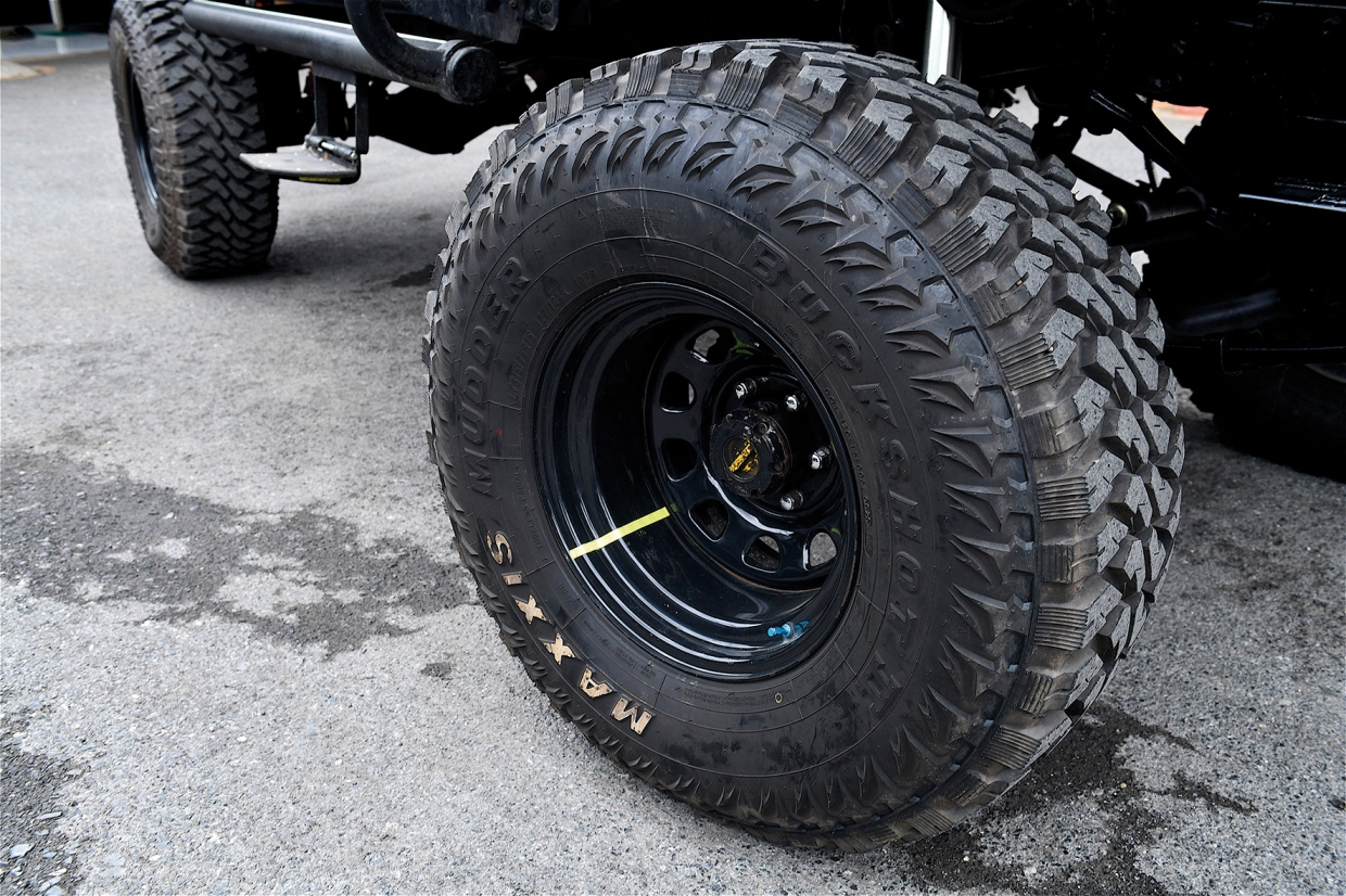 ส่วนล้อถอดเปลี่ยนใหม่ให้ใหญ่ขึ้น ล้อขนาด 16 นิ้ว สีดำ กว้าง 10 นิ้ว พร้อมยางลุยของ MAXXIS (แมกซ์ซิส) รุ่น MUDDER BUCKSHOT II (มัดเดอร์ บัคชอท ทู) ขนาด 315/75 R16