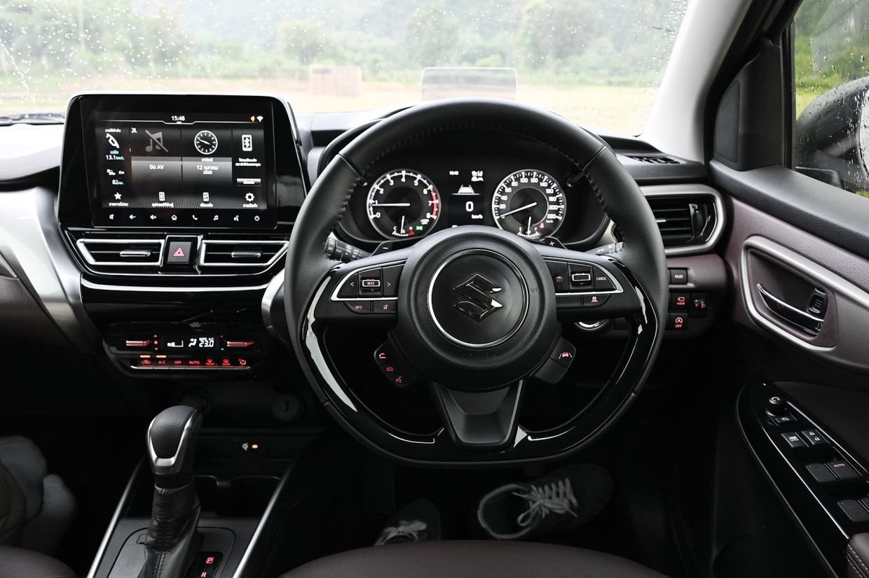 สิ่งที่ชื่นชอบในตัว SUZUKI FRONX อีกอย่างก็คือ ระบบช่วยเหลือต่างๆ แม้ว่าจะได้ทดลองขับชมวิวบรรยากาศในวังเวียงไม่มากเท่าไรนัก แต่ก็พอได้ทดลองระบบต่างๆ อยู่พอสมควร อย่างแรก คือ ADAPTIVE CRUISE CONTROL (ACC) หรือระบบควบคุมความเร็วอัตโนมัติแบบแปรผัน ทำได้ดีทั้งอัตราเร่ง ทำระยะห่างจากรถคันแรก และการเบรคเพื่อเว้นระยะห่างตามที่เราตั้งค่าเอาไว้ เบรคได้นุ่มนวลกว่าที่คิด และระบบช่วยควบคุมรถให้อยู่ในเลน LANE KEEP ASSIST (LKA) ก็ไม่ได้กระชาก หรือเตือนเรามากขนาดนั้น