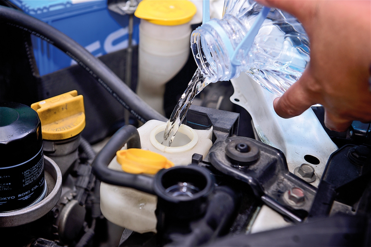 6. เติมน้ำลงไปในช่องฝาหม้อน้ำ จนน้ำที่ไหลออกมาสะอาด