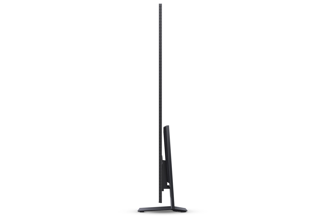 ขาตั้งตรงกลางออกแบบเรียบง่าย แต่ดูดี ด้วยผิวสัมผัสโลหะที่สวยงาม ดีไซจ์นโลหะยังต่อเนื่องไปถึงขอบหน้าจอ ทำให้ภาพรวมของทีวีดูคลาสสิคและหรูหรา อย่างแท้จริง