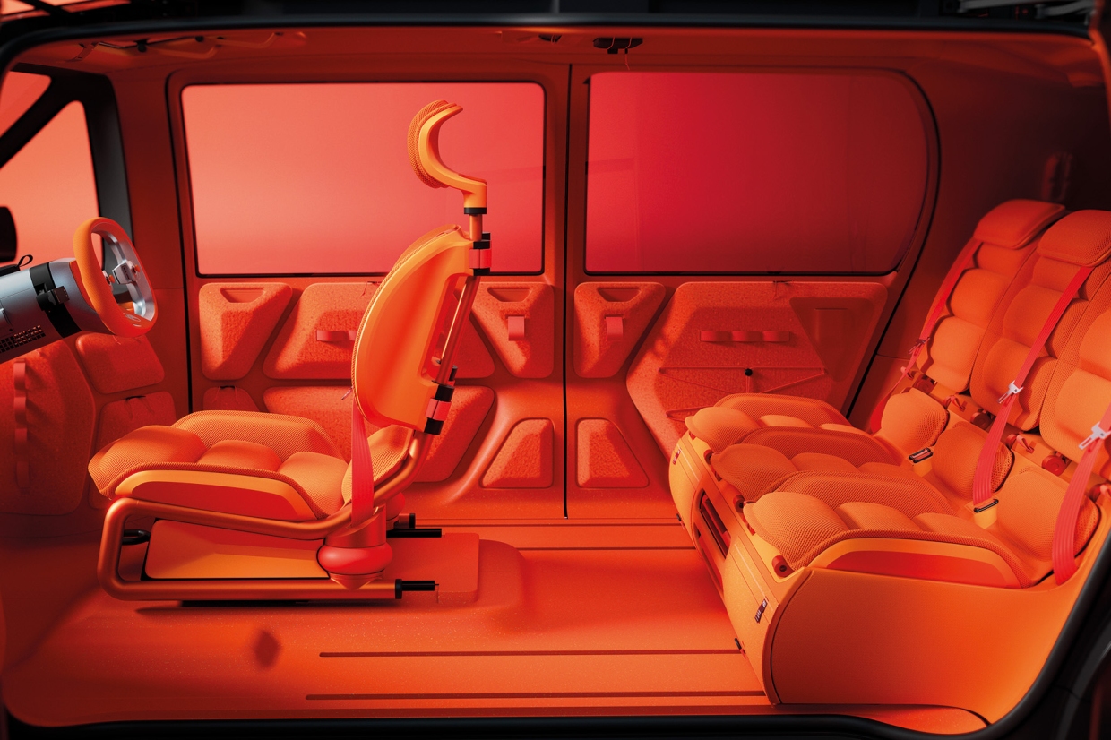 ตัวถังซึ่งยาว 4.10 ม. และสูง 1.70 ม. มีห้องโดยสารพื้นเรียบ ติดตั้งเก้าอี้ที่นั่งรวม 6 ตัว (3+3) เก้าอี้ที่นั่งแถวหน้ามีเก้าอี้ผู้ขับอยู่ตรงกลาง มีเก้าอี้ผู้โดยสารขนาบข้าง และอยู่เยื้องไปข้างหลังเล็กน้อย เก้าอี้ผู้ขับออกแบบเป็นพิเศษ สามารถหมุนได้รอบตัว เพื่อให้สอดรับกับทุกสถานการณ์ คือ ทั้งขณะขับรถ ทั้งขณะทำงาน และทั้งเมื่อกำลังมีปฏิสัมพันธ์กับผู้อื่น ส่วนเก้าอี้ผู้โดยสารทั้ง 2 ด้าน เมื่อไม่ต้องการใช้ก็สามารถยกออก แล้วนำเข้าไปเก็บไว้ใต้เก้าอี้ที่นั่งตัวริมในแถว 2