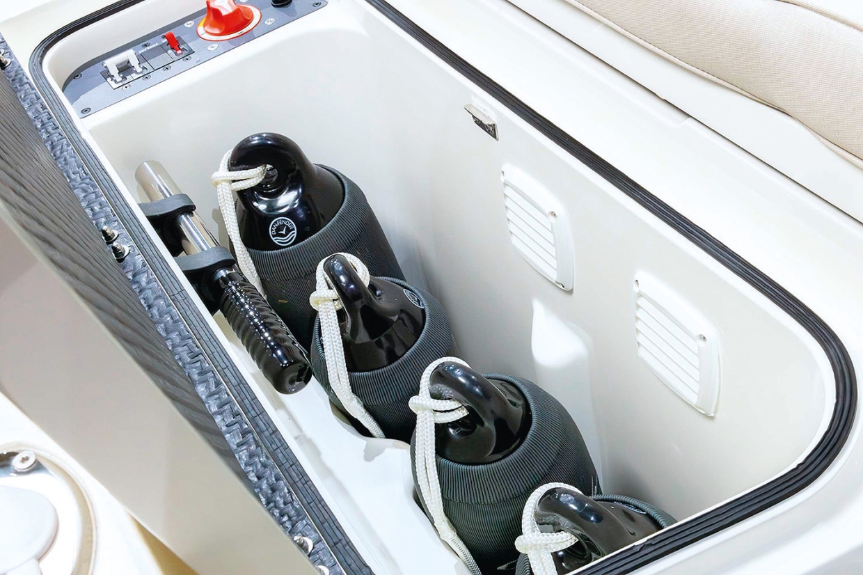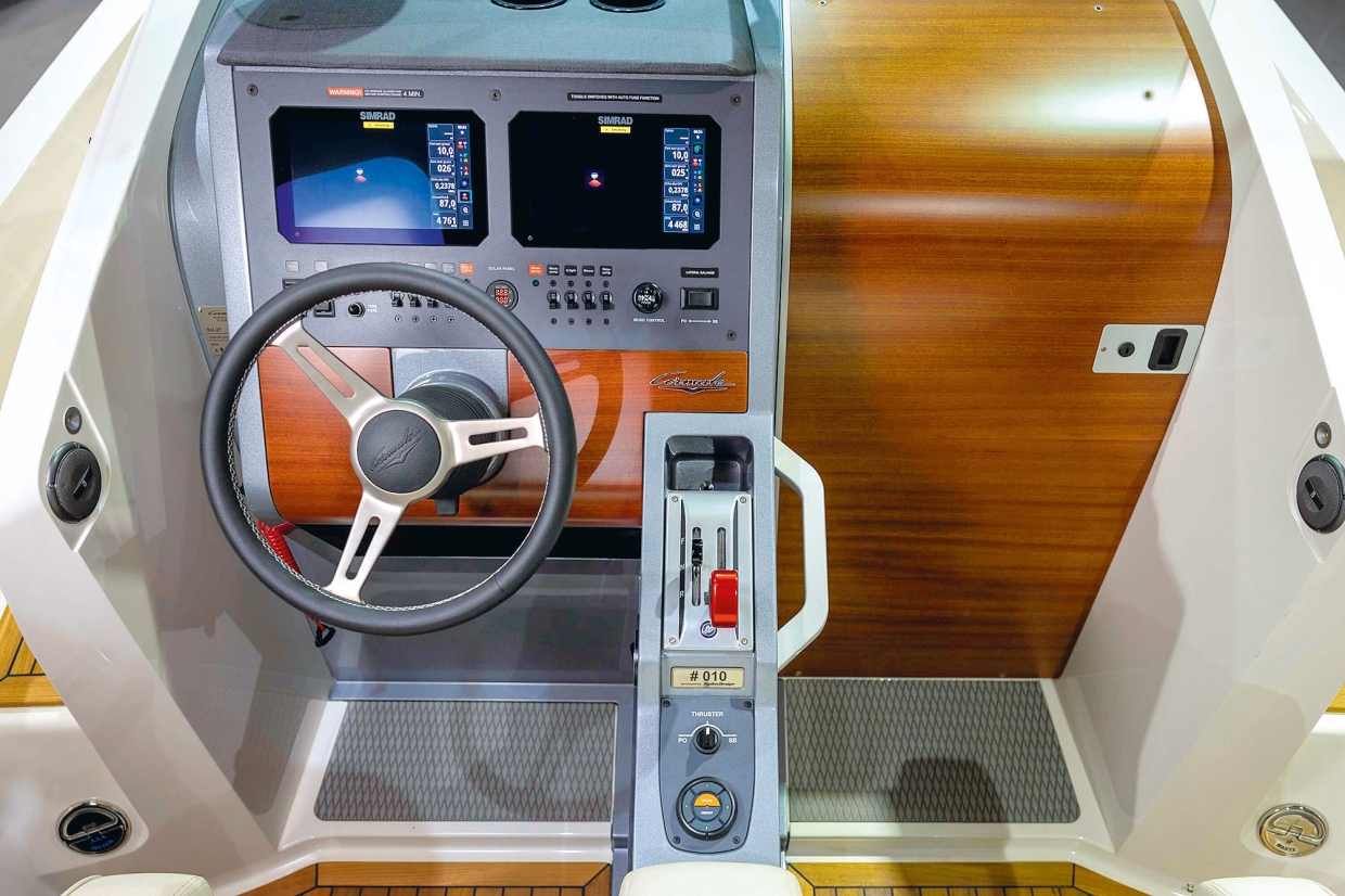 ในส่วนของตำแหน่งควบคุมเรือ ถือเป็นพื้นที่ที่น่าประทับใจอย่างแท้จริง ตัวเบาะ และที่พิงถูกออกแบบให้ลึก มั่นคง พร้อมการรองรับด้านข้างที่ยอดเยี่ยม กระจกบังลมเอียง และไร้กรอบเพื่อลดน้ำหนัก แต่ก็ยังมีจุดให้จับยึดเพียงพอชดเชยได้อย่างเหมาะสม สวิทช์แบบโยกบนแผงหน้าปัด รวมถึงสวิทช์ควบคุมทรัสเตอร์ ให้บรรยากาศคล้ายเครื่องบินขับไล่ยุคสงครามโลกครั้งที่ 2 อย่างมีเสน่ห์ สวิทช์โยกแบบเรียบง่ายที่ใช้ควบคุม TAB ฝั่งซ้ายเพียงฝั่งเดียว สำหรับปรับสมดุลด้านข้าง ก็เป็นอีกตัวอย่างหนึ่งของการออกแบบที่ผสานทั้งสไตล์ และการใช้งานจริง