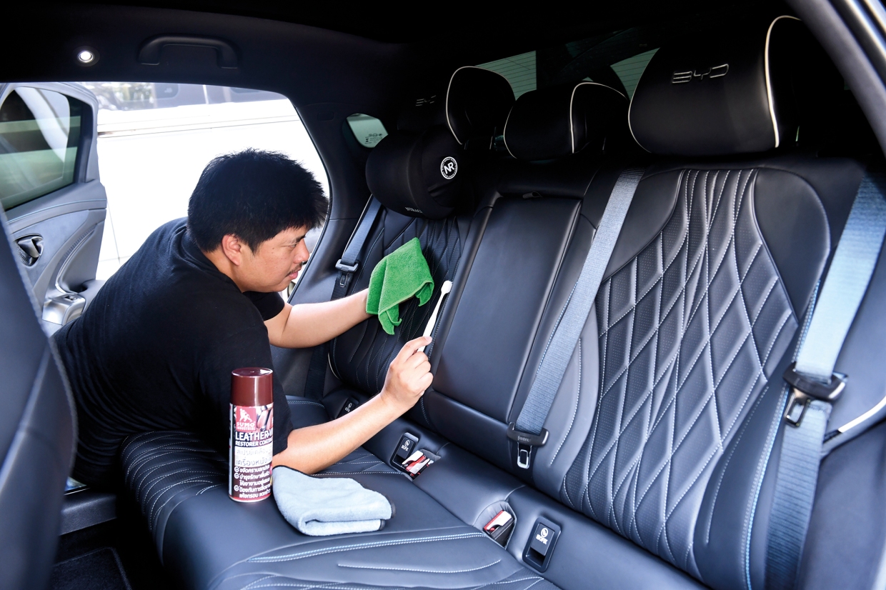 6. นำสเปรย์เคลือบเบาะหนัง ค่อยๆ ฉีดใส่ไปทีละส่วน
