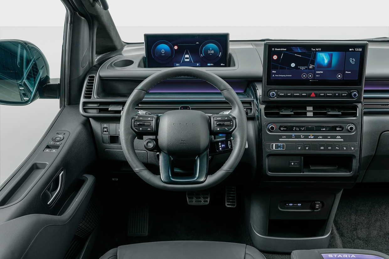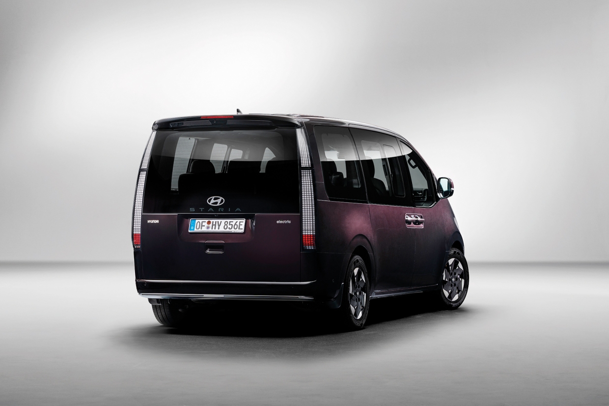 ส่วน HYUNDAI STARIA ELECTRIC ที่เพิ่งเปิดตัวนี้ อยู่ในตัวถังแบบเดียวกัน และขนาดเดียวกันกับรถเครื่องยนต์สันดาปภายใน และรถไฮบริดที่กล่าวข้างต้น เป็นตัวถัง ยาว 5.255 ม. กว้าง 1.995 ม. สูง 1.990 ม. และมีช่วงฐานล้อยาว 3.275 ม. ซึ่งทำห้องโดยสารเป็น 2 แบบ คือแบบ 7 ที่นั่ง (2+2+3) ซึ่งมีชื่อเฉพาะว่า HYUNDAI STARIA LUXURY (ฮันเด สตารีอา ลักชัวรี) กับแบบ 9 ที่นั่ง (2+2+2+3) ซึ่งมีชื่อเฉพาะว่า HYUNDAI STARIA WAGON (ฮันเด สตารีอา แวกอน)