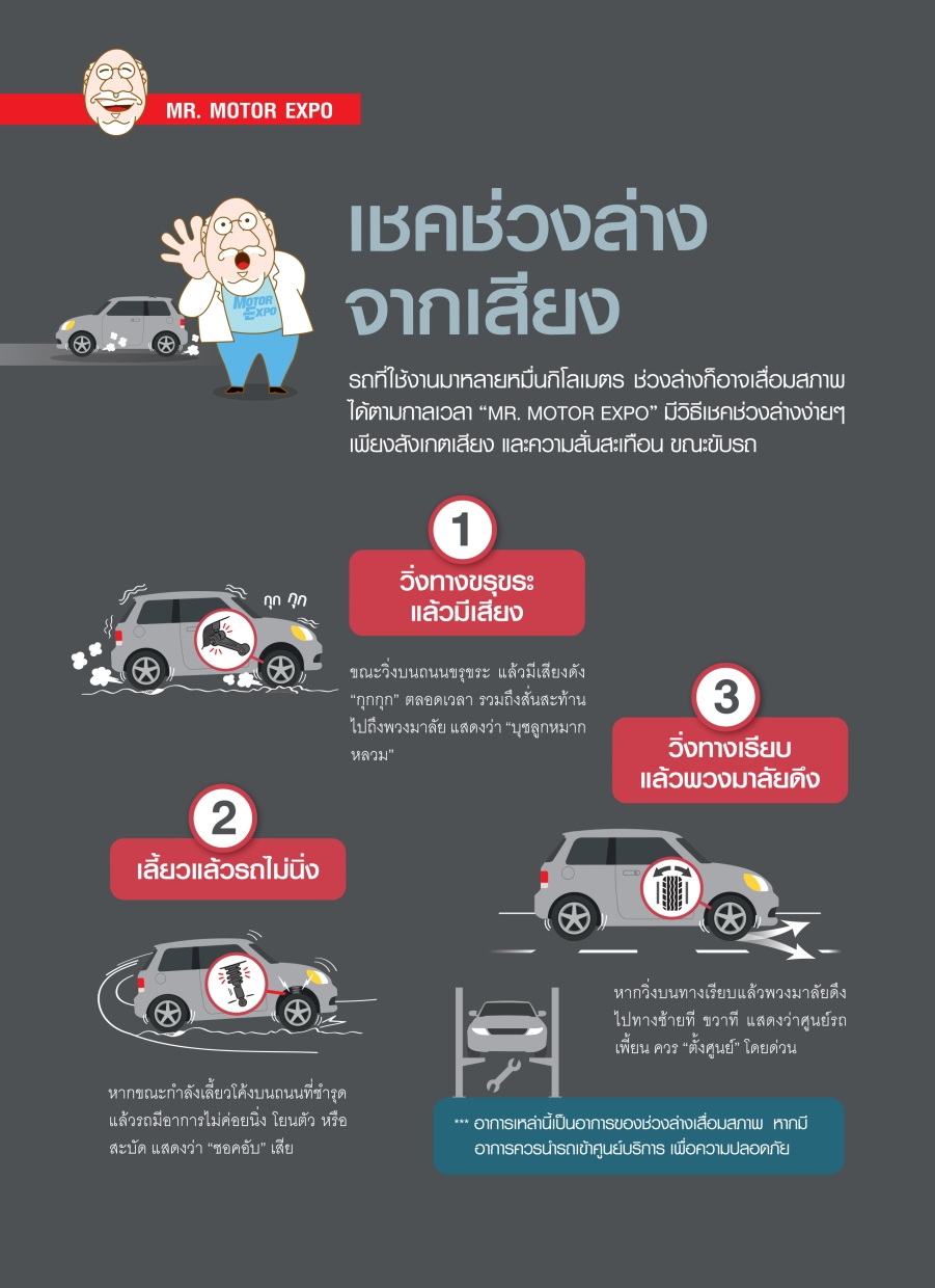 รถที่ใช้งานมาหลายหมื่นกิโลเมตร ช่วงล่างก็อาจเสื่อมสภาพได้ ตามกาลเวลา “MR. MOTOR EXPO” มีวิธีเชคช่วงล่างง่ายๆ เพียงสังเกตเสียง และความสั่นสะเทือน ขณะขับรถ