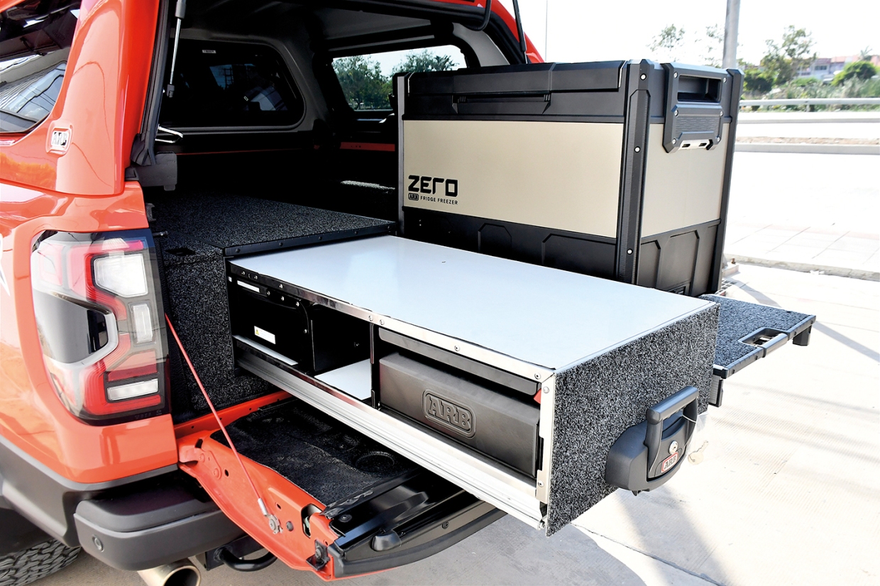 ใต้หลังคามีระบบลิ้นชักเก็บของ ARB (ARB OUTBACK SOLUTIONS DRAWERS) มีลิ้นชัก 2 ขนาด ด้านซ้ายเป็นลิ้นชักทรงลึกเต็มความยาว สำหรับใส่สัมภาระขนาดใหญ่ ด้านขวาเป็นลิ้นชักแบบมีสไลด์ในตัว ที่ออกแบบมาเพื่อวางตู้เย็น