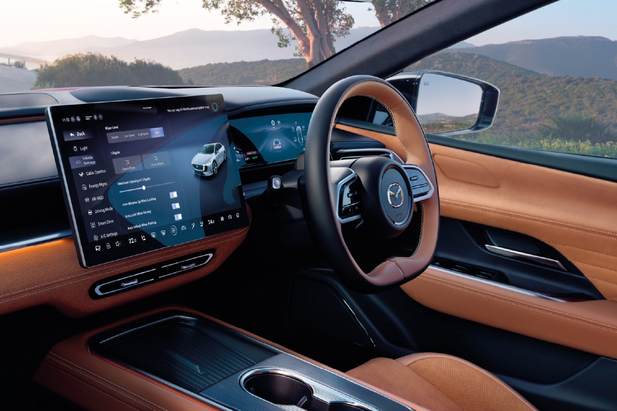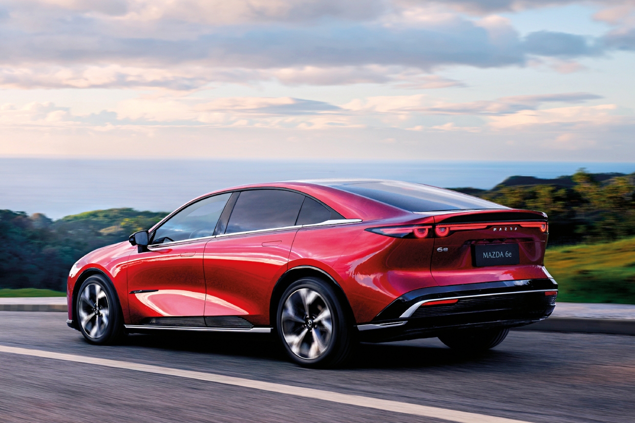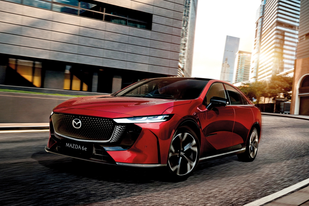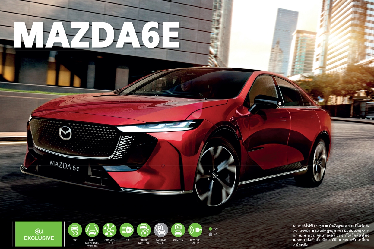 MAZDA6E (มาซดา 6 อี) รถยนต์ไฟฟ้าสไตล์สปอร์ทซีดาน เป็นการประเดิมการทำตลาดรถยนต์ไฟฟ้าเต็มตัวในประเทศไทยครั้งแรกของค่าย เส้นสายโฉบเฉี่ยว กระจังหน้าทรงห้าเหลี่ยม เอกลักษณ์ของ MAZDA เป็นแบบปิดทึบ ลดแรงต้านอากาศ ไฟหน้าทรงเรียวบาง และไฟท้ายที่พาดยาวตลอดช่วงความกว้างของตัวรถ ล้อแมก 19 นิ้ว มิติตัวถังโดยรวม ความยาว 4,921 มม. และระยะฐานล้อ 2,895 มม.