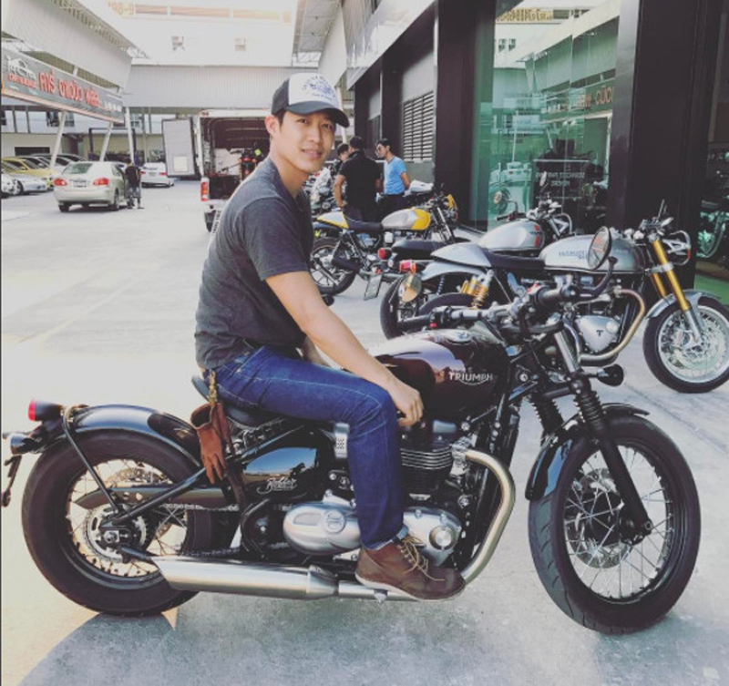 หนุ่มอารมณ์ดี แอมป์-พีรวัศ กุลนันท์วัฒน์ ที่สีเสื้อช่างแมทช์กับสีรถ ทไรอัมฟ์ บอนเนวิลล์ บอบเบอร์ เสียจริง