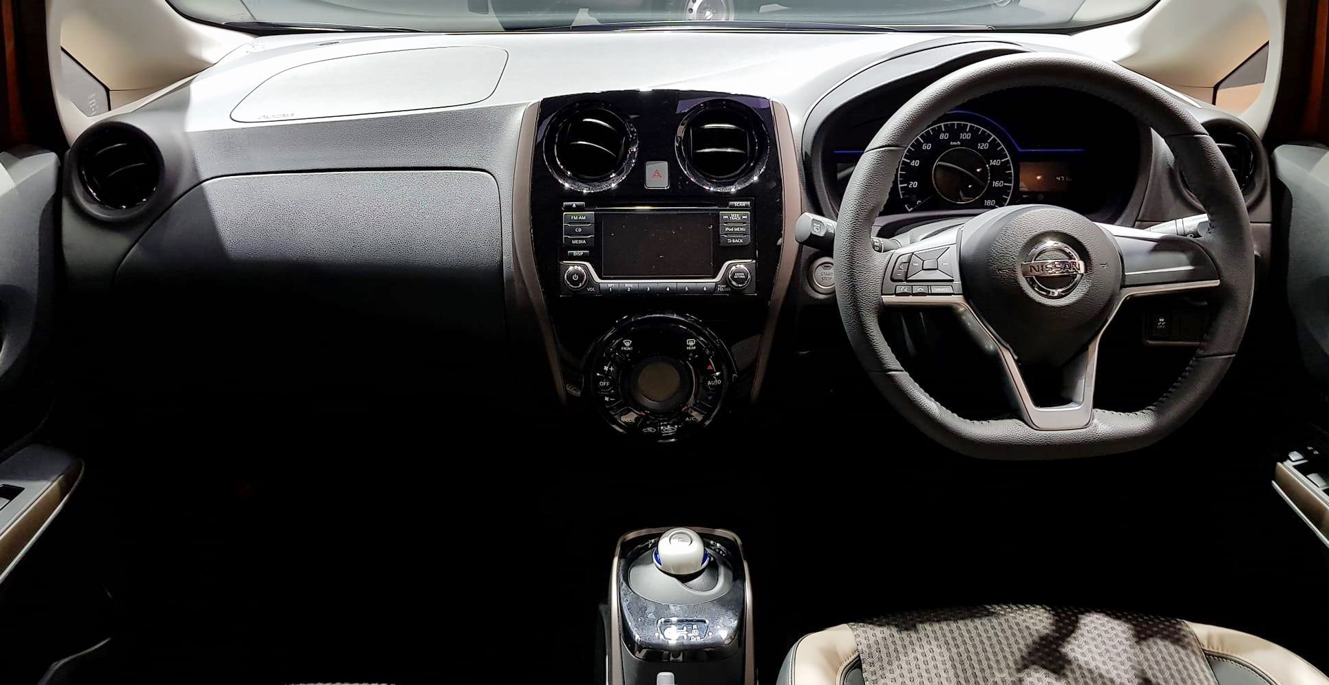 ขณะที่ห้องโดยสารยังคงโดดเด่นด้วยความกว้างขวาง ใช้งานได้อเนกประสงคืใกล้เคียงมีนีเอมพีวี แต่จุดแตกต่างสามารถสังเกตเห็นได้ไม่ยาก เริ่มจากคันเกียร์เดิมถูกถอดออกไป แทนที่ด้วยแป้นทรงแบนสำหรับเปลี่ยนโหมดเกียร์ นอกจากนี้รูปแบบของแผงหน้าปัดก็เปลี่ยนไป ตรงกลางเป็นมาตรวัดความเร็วขนาดใหญ่ ขนาบข้างด้วยจอแสดงผลแบบดิจิทอล นอกจากนี้จากการที่ชุดแบทเตอรีถูกติดตั้งใต้เบาะคู่หน้า พื้นที่ใต้เบาะจึงถูกปิดทึบ ู้โดยสารด้านหลังไม่สามารถสอดเท้าเข้ามาได้ แต่ไม่น่าเป็นปัญหาอะไร เพราะ Nissan Note e-Power มีพื้นที่วางขาเหลือเฟืออยู่แล้ว ขณะที่อุปกรณ์ที่ติดตั้งมาให้เทียบเคียงกับ Nissan Note ตัวทอพ VL ที่กำลังทำตลาดอยู่ โดยเฉพาะ ระบบกล้องมองภาพรอบคัน ตลอดจนระบบระบบเตือนการชนด้านหน้า และช่วยชะลอความเร็ว