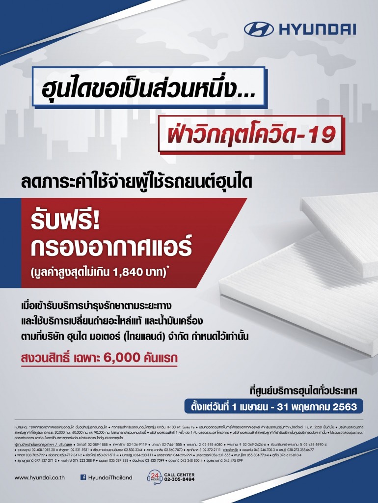 จากสถานการณ์การแพร่ระบาดของเชื้อไวรัส โควิด-19 ฮุนได มอเตอร์ (ไทยแลนด์)ฯ ขอร่วมเป็นส่วนหนึ่งในการช่วยลดความเสี่ยงของการสะสมเชื้อโรคภายในห้องโดยสารของรถยนต์ด้วยการพ่นน้ำยาฆ่าเชื้อภายในห้องโดยสารฟรี ตั้งแต่วันนี้-16 พฤษภาคม 2563