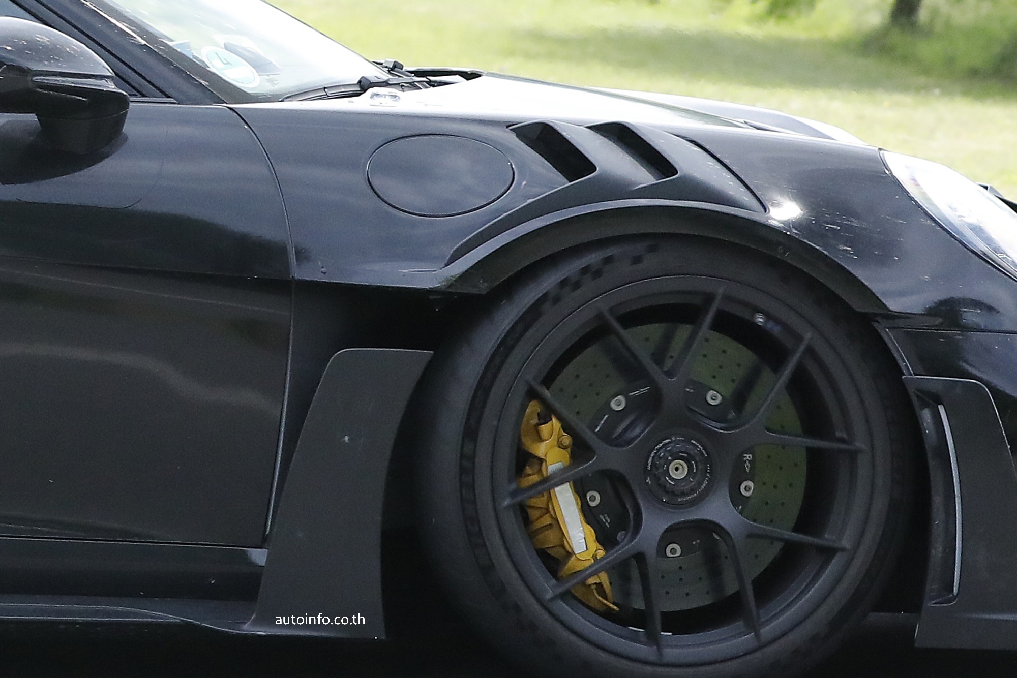 ส่วนที่เป็นปริศนาชวนขบคิดอยู่ที่บังโคลนบนด้านขวาของรถทดสอบคันนี้ที่ดูเหมือนจะเป็นตำแหน่งของจุดชาร์จพลังงานที่ชวนให้คิดถึง Porsche Taycan ที่อยู่ต่ำกว่าตำแหน่งของฝาถังน้ำมันปกติ ซึ่ง Porsche เองก็เคยยืนยันถึงความเป็นไปได้ของ Porsche 992 ที่ขับเคลื่อนด้วยพลังงานไฟฟ้า ซึ่งก็อาจรวมถึงในเวอร์ชัน GT3 RS ด้วย รวมไปถึงปัญหาในเรื่องของน้ำหนักของแบทเตอรีที่ต้องคำนึงถึงเป็นพิเศษสำหรับรถยนต์ที่สามารถนำเข้าแข่งขันความเร็วทางเรียบได้ เช่น Porsche GT3 RS โมเดลนี้