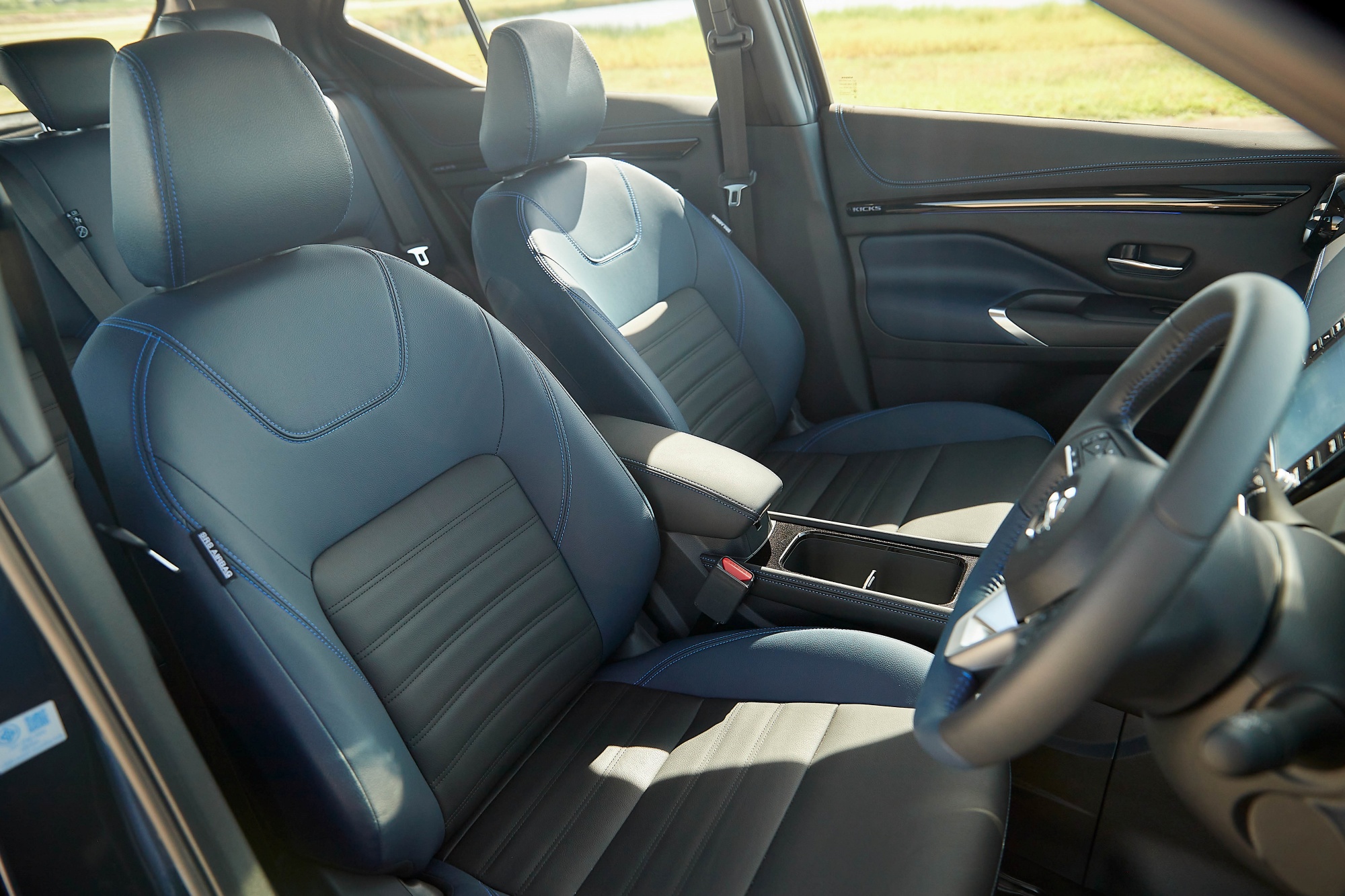 ภายในห้องโดยสาร ออกแบบด้วยโทนสีดำ ตกแต่งด้วยสีน้ำเงิน สอดคล้องกับคอนโซลหน้า ขณะที่คอนโซลกลาง ตกแต่งด้วยวัสดุหนังสังเคราะห์สีดำ เดินด้ายสีน้ำเงินที่ตัดกันอย่างลงตัว เสริมด้วยวัสดุสีดำเงา เพียโน บแลค ช่วยเพิ่มอารมณ์สปอร์ท สำหรับ Nissan Kicks e-POWER ใหม่ ทุกรุ่นมาพร้อมพวงมาลัยหุ้มด้วยหนังแท้ และคอนโซลกลางใหม่