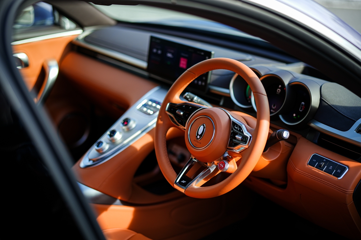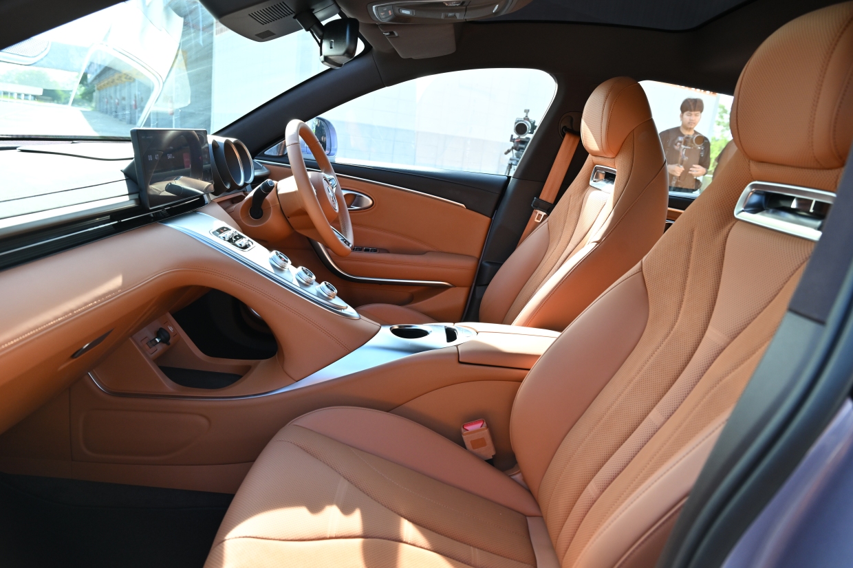 ภายในห้องโดยสารเรียบง่ายสไตล์มีนีมอล มาพร้อมกับคอนโซลกลางรูปตัว T ลาดลงจากคอนโซลหน้า และการตกแต่งด้วยไฟสีสร้างบรรยากาศ Ambient Light เบาะคู่หน้าที่โอบรับผู้ขับ/ผู้โดยสาร โดยรุ่น Long Range ภายในเป็นสีดำ