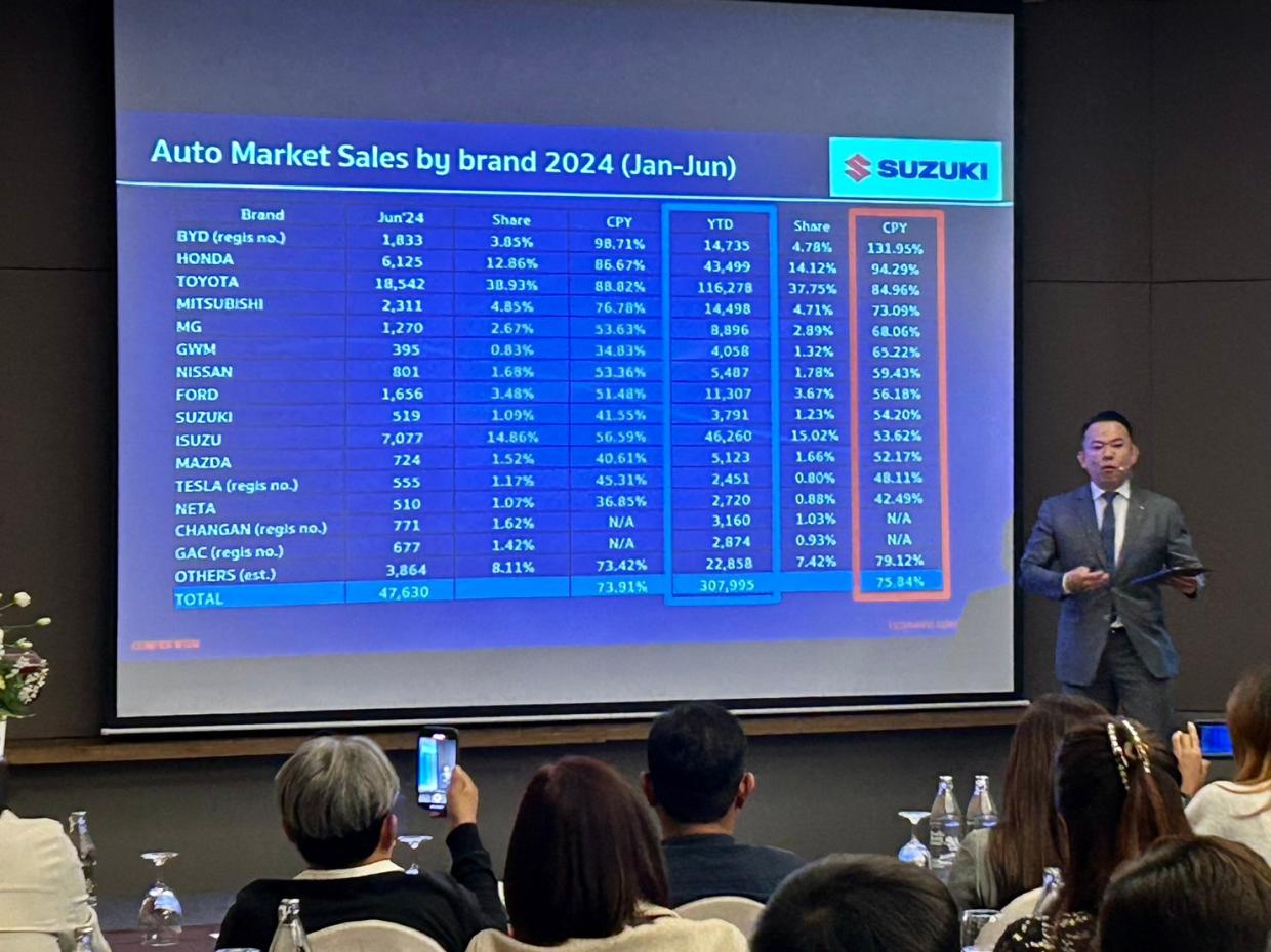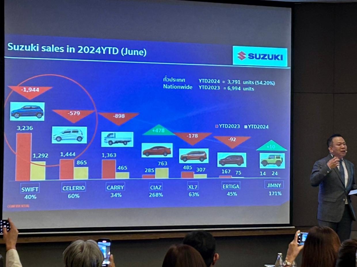 ทาดาโอะมิ ซูซูกิ ประธานกรรมการบริหาร บริษัท ซูซูกิ มอเตอร์ (ประเทศไทย) จำกัด กล่าวว่า สถานการณ์ตลาดรถยนต์ในประเทศยังคงซบเซา ช่วงระยะเวลา 6 เดือนที่ผ่านมา (เดือนมกราคม-มิถุนายน) ตลาดรถยนต์รวมมียอดขายอยู่ที่ 307,995 คัน สำหรับ Suzuki ยอดขายรวมทั้งสิ้น 3,791 คัน ลดลง 54 % จากช่วงเวลาเดียวกันของปี 2023 ปัจจัยหลักที่ส่งผลให้ตลาดยังคงหดตัว คือ ปัญหาสภาวะเศรษฐกิจที่ซบเซา ส่งผลให้ปัญหาหนี้ครัวเรือน และค่าครองชีพพุ่งสูงขึ้น กระทบต่อการปล่อยสินเชื่อของสถาบันการเงินอย่างชัดเจน