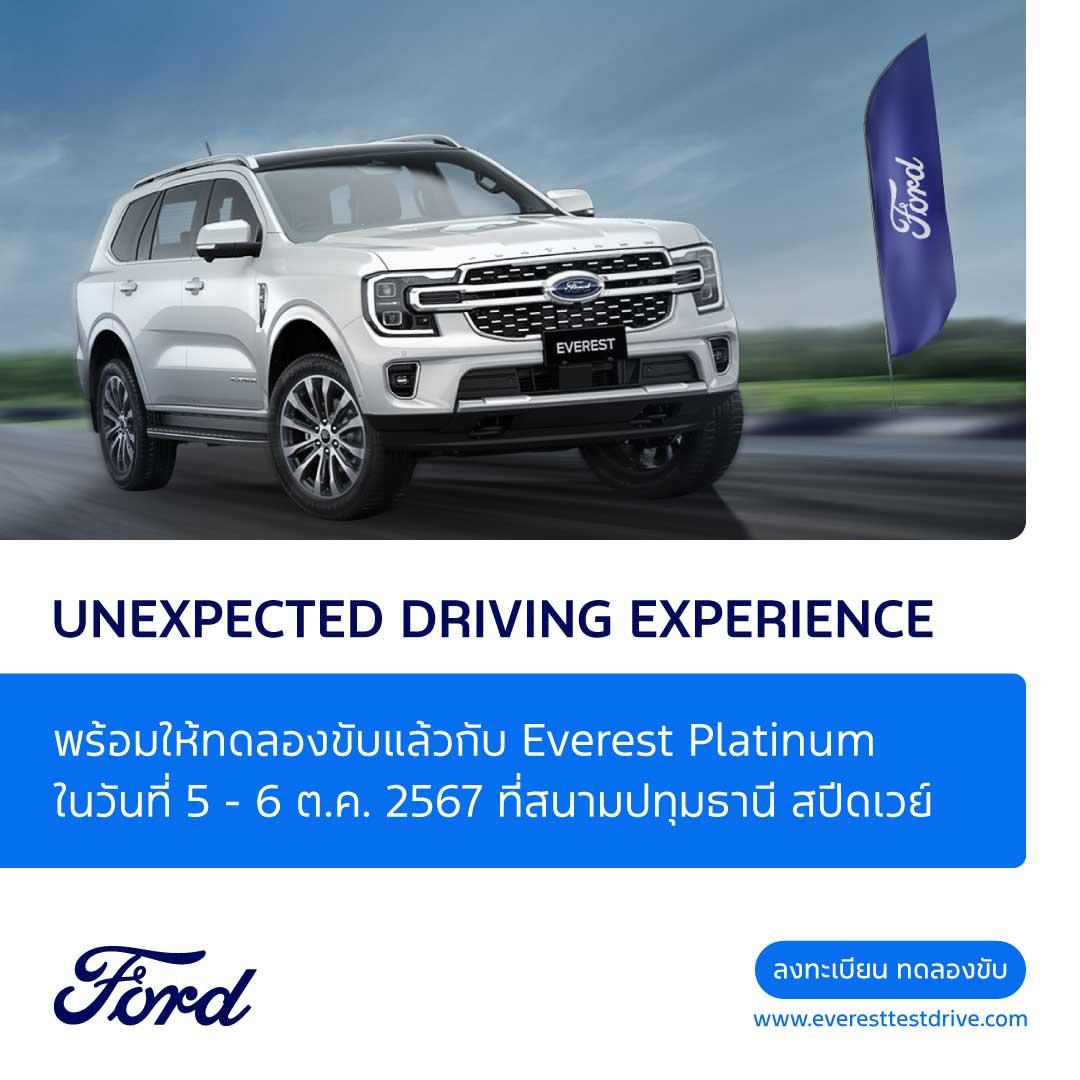 พร้อมเชิญชวนผู้ที่สนใจร่วมสัมผัสประสบการณ์การขับขี่ Ford Everest Platinum ที่จะทำให้คุณรู้สึกถึงความ "กล้าทุกความท้าทาย" ในกิจกรรม "The Unexpected Driving Experience" วันที่ 5-6 ตุลาคมนี้ ณ สนามปทุมธานี สปีดเวย์